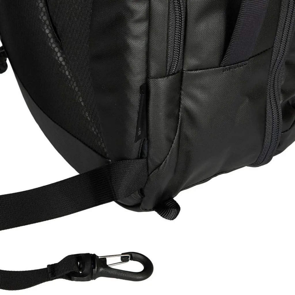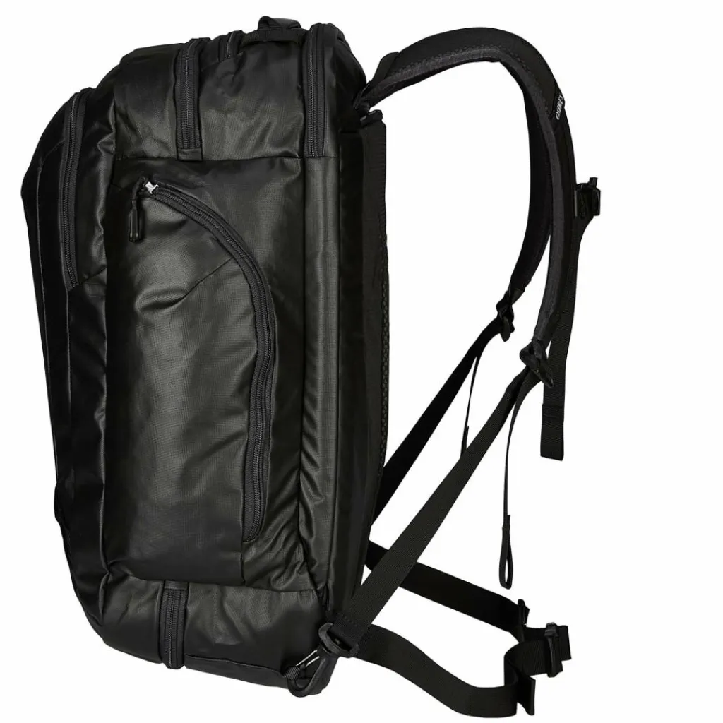 Das mit Carbonat beschichtete Nylon-Hauptmaterial ist stark wasserabweisend und sehr abriebfest und schafft es gleichzeitig, vergleichsweise leicht zu sein. Schmutz und Wasser machen dem Kofferrucksack daher wenig aus, ebenso wie grobes Handling am Flughafen. Die Außen- und Innenmaterialien sind zu 100 % recycelt und das Produkt ist bluesign-zertifiziert.