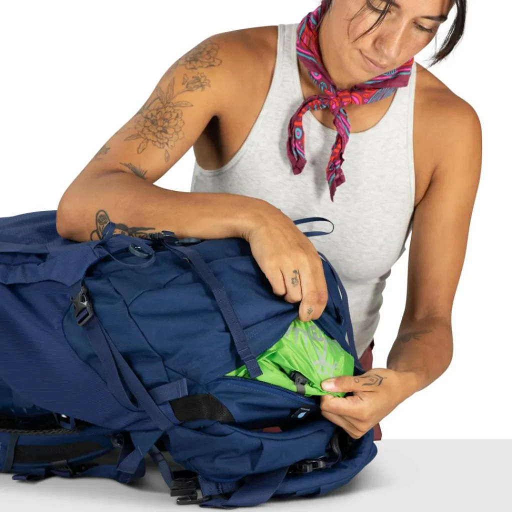 Auf mehrtägigen Touren behältst du dank der intuitiven Fächer stets den Überblick über deine Ausrüstung. Das geräumige Hauptfach lässt sich für entspanntes Bepacken auch seitlich öffnen. Daneben bieten zwei RV-Fächer im Deckel dir Platz für Dinge, auf die du schnellen Zugriff möchtest, zum Beispiel dein Erste-Hilfe-Set oder Taschenmesser. Dank zweier Fächer auf den Hüftflossen musst du den Rucksack für kleine Snacks auf dem Trail nicht abnehmen. Wenn du auch deinen Durst löschen möchtest, ohne den Rucksack abzunehmen, kannst du den Kyte LT 45 zusätzlich mit einer Trinkblase bestücken (optional erhältlich).
