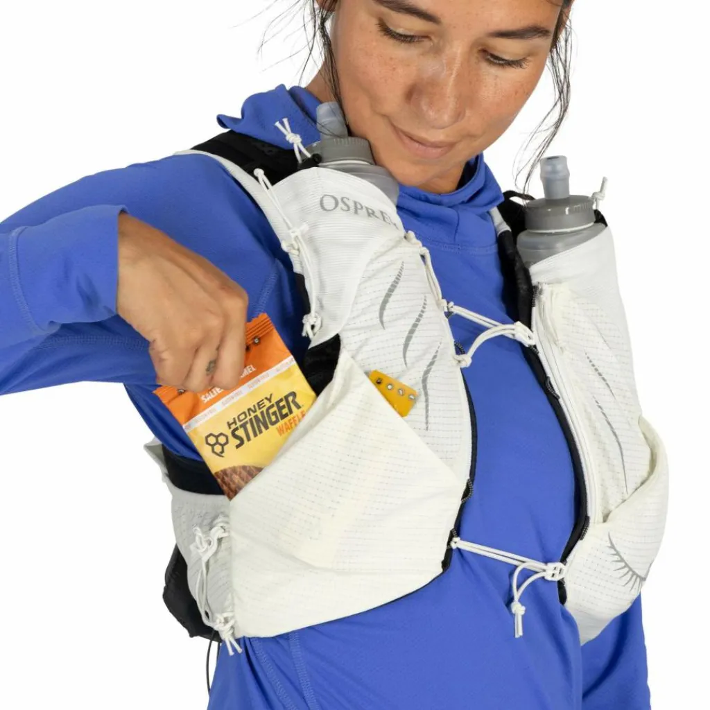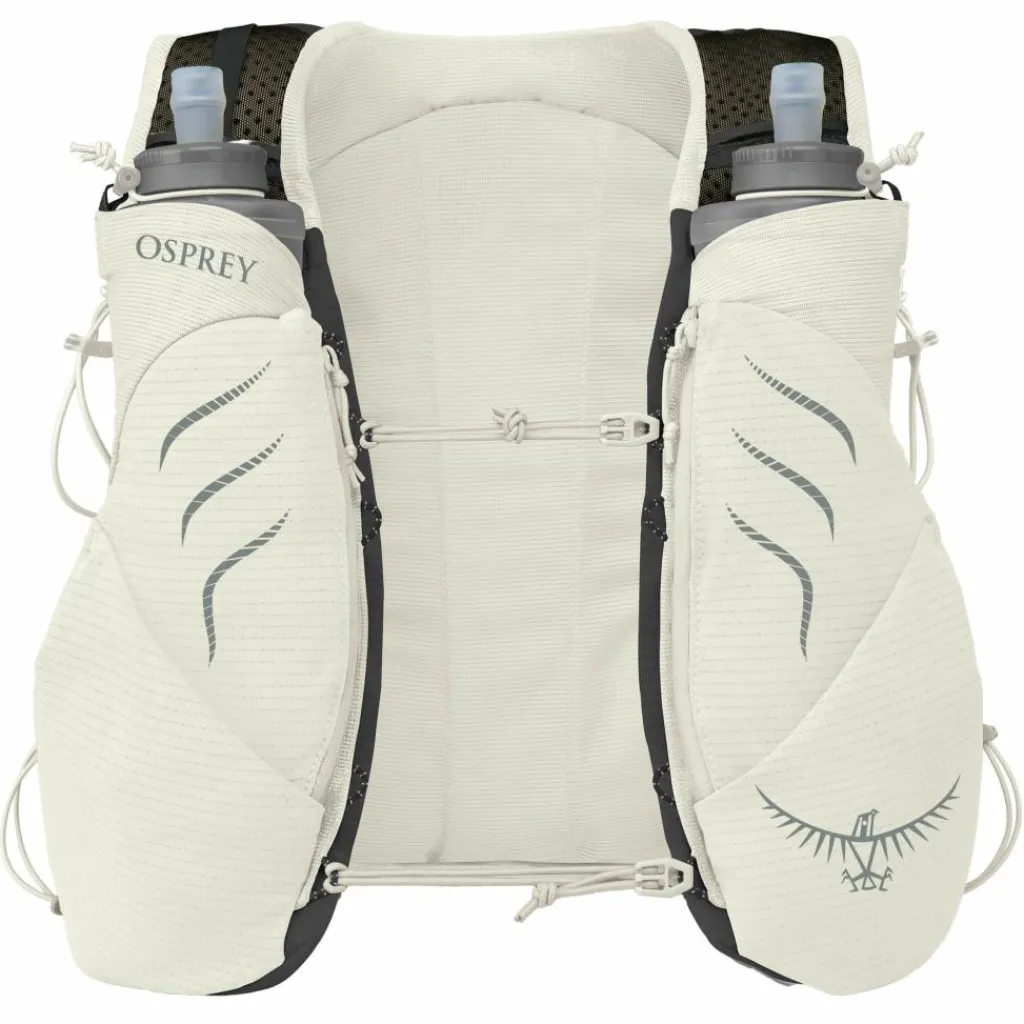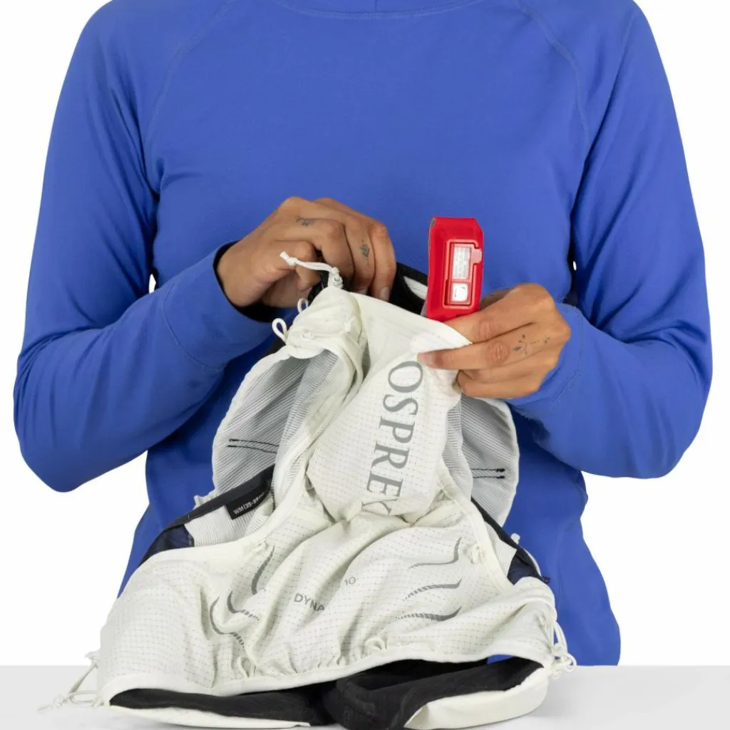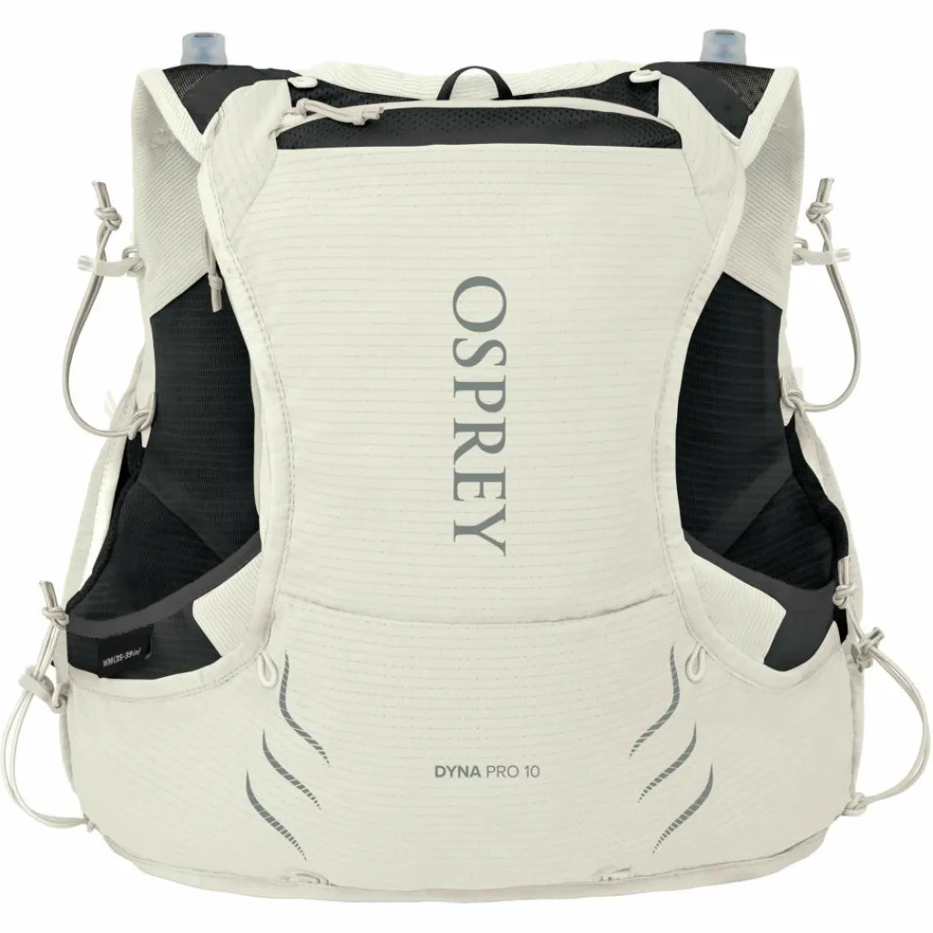 Zwei 500 ml Softflasks sorgen dafür, dass du stets mit Flüssigkeit versorgt bleibst. Für längere Durststrecken auf abgelegenen Trails lässt sich die Dyna 10 Pro zudem mit Ospreys Hydraulics LT 1.5 L Trinkblase (optional erhältlich) bestücken und das Trinkvolumen dadurch auf satte 2,5 L erweitern. Für Energieriegel oder die Stirnlampe gibt es mehrere Steckfächer und auch das Smartphone ist dank zweier RV-Fächer auf der Brust immer griffbereit. Deine Regenjacke kannst du zudem im elastischen Steckfach am Rücken unterbringen.