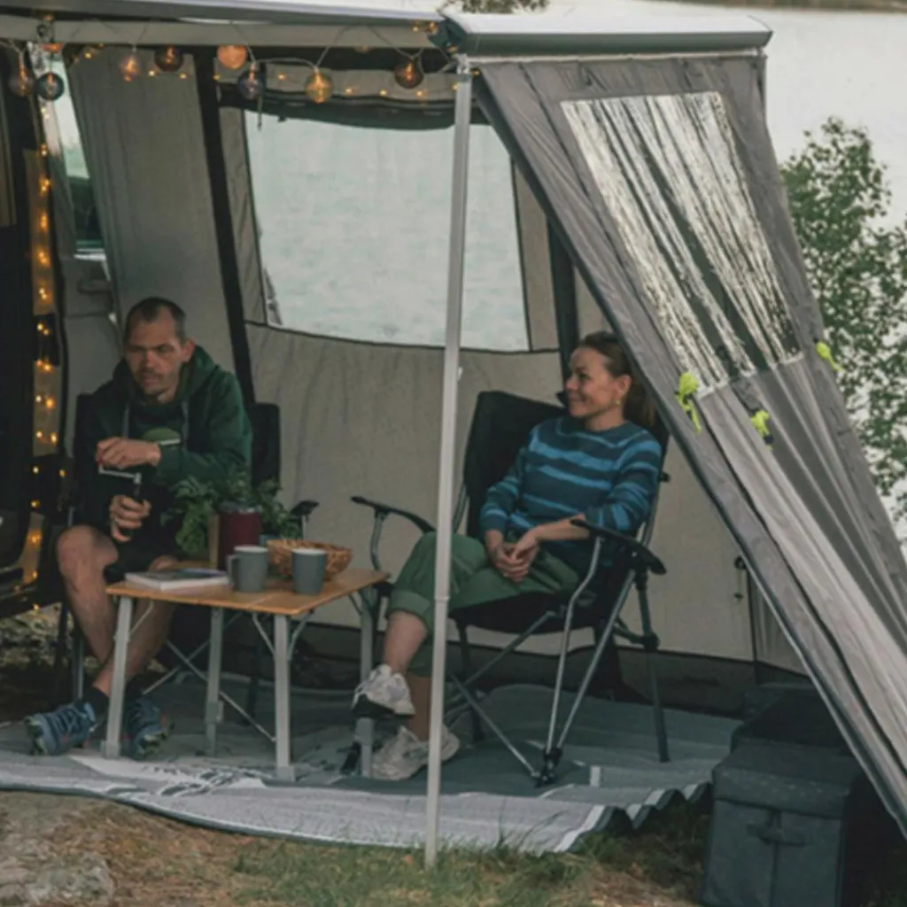 Das Set aus praktischen Markisen-Ergänzungen verwandelt die Markise deines Camper Vans im Handumdrehen in einen Wohnraum, der vor Wind, Wetter und Blicken geschützt ist.