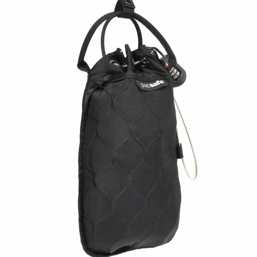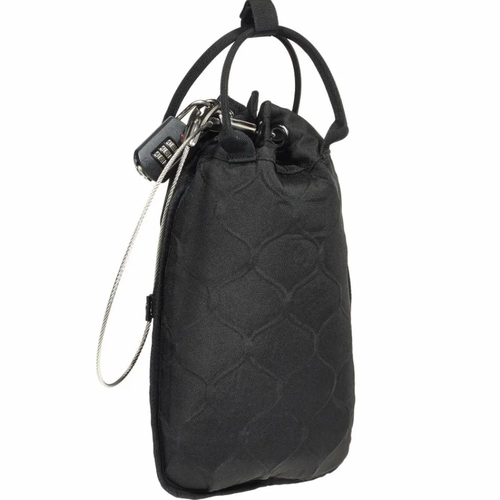 Der Travelsafe 3 L ist geformt wie ein kleines Säckchen. Innen ist er mit weichem Fleece ausgekleidet, damit dein Schmuck und deine Bildschirme vor Kratzern geschützt sind. Außen besteht er aus einem festen Gewebe. Dazwischen ist ein Edelstahl-Drahtkäfig eingebaut, der oben mit einem dicken Stahlseil und Zahlenschloss geschlossen und gesichert wird. Das Drahtgewebe verhindert ein Aufschlitzen des Travelsafe 3 L.