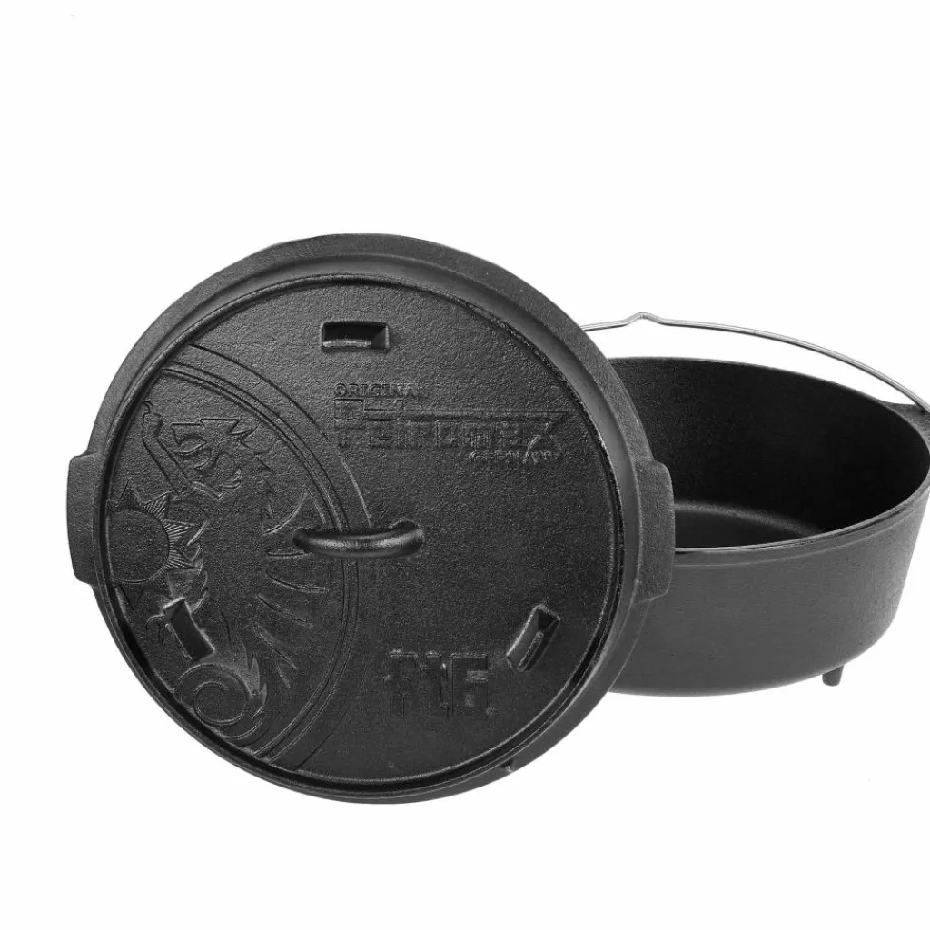 Der Deckel des Feuertopfs kann zudem optional als Servierplatte oder Pfanne genutzt werden. Dank der vorbehandelten Oberfläche (seasoned finished) kannst du den robusten Petromax Feuertopf aus Gusseisen sofort einsetzen.