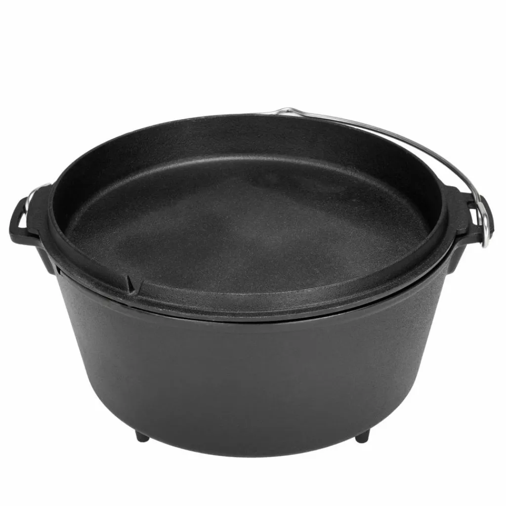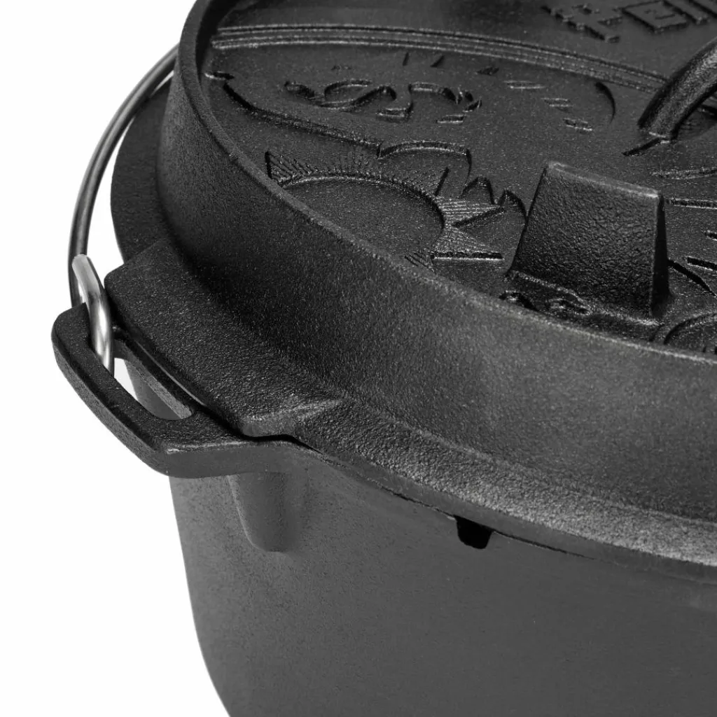 Schwerer Dutch Oven mit Standfüßen zur Zubereitung von Speisen über dem Lagerfeuer oder im Ofen. Er eignet sich zum Garen ebenso wie für leckere Eintöpfe, Suppen, Fleisch und Gemüse.