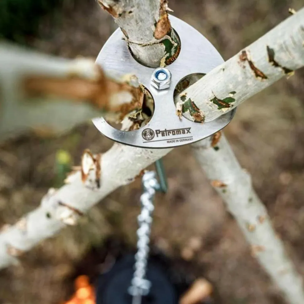 Mit diesem nützlichen Ring bastelst du dir im Handumdrehen ein Dreibein. Dafür schiebst du einfach Äste in gewünschter Länge durch die Öffnungen und stellst diese auf. Inkl. längenverstellbarer Kette.
