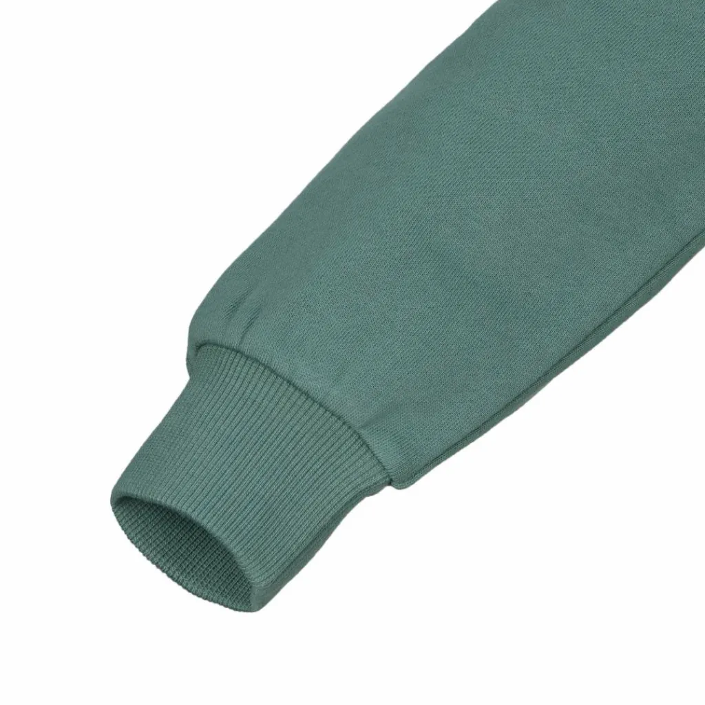 In den kleineren Größen (86 bis 92) sind an einer Schulter Druckknöpfe angebracht, die das An- und Ausziehen erleichtern. Am Halsausschnitt, an den Ärmeln und am Saum kommen Rippstrick-Bündchen zum Einsatz, die für einen guten Sitz sorgen. Außerdem bleiben die Ärmel durch die dehnbaren Bündchen viel leichter oben, wenn sie zum beim Händewaschen hochgezogen werden. Die lässige Känguru-Tasche bietet Platz für wichtigen Kleinkram und kalte Hände.