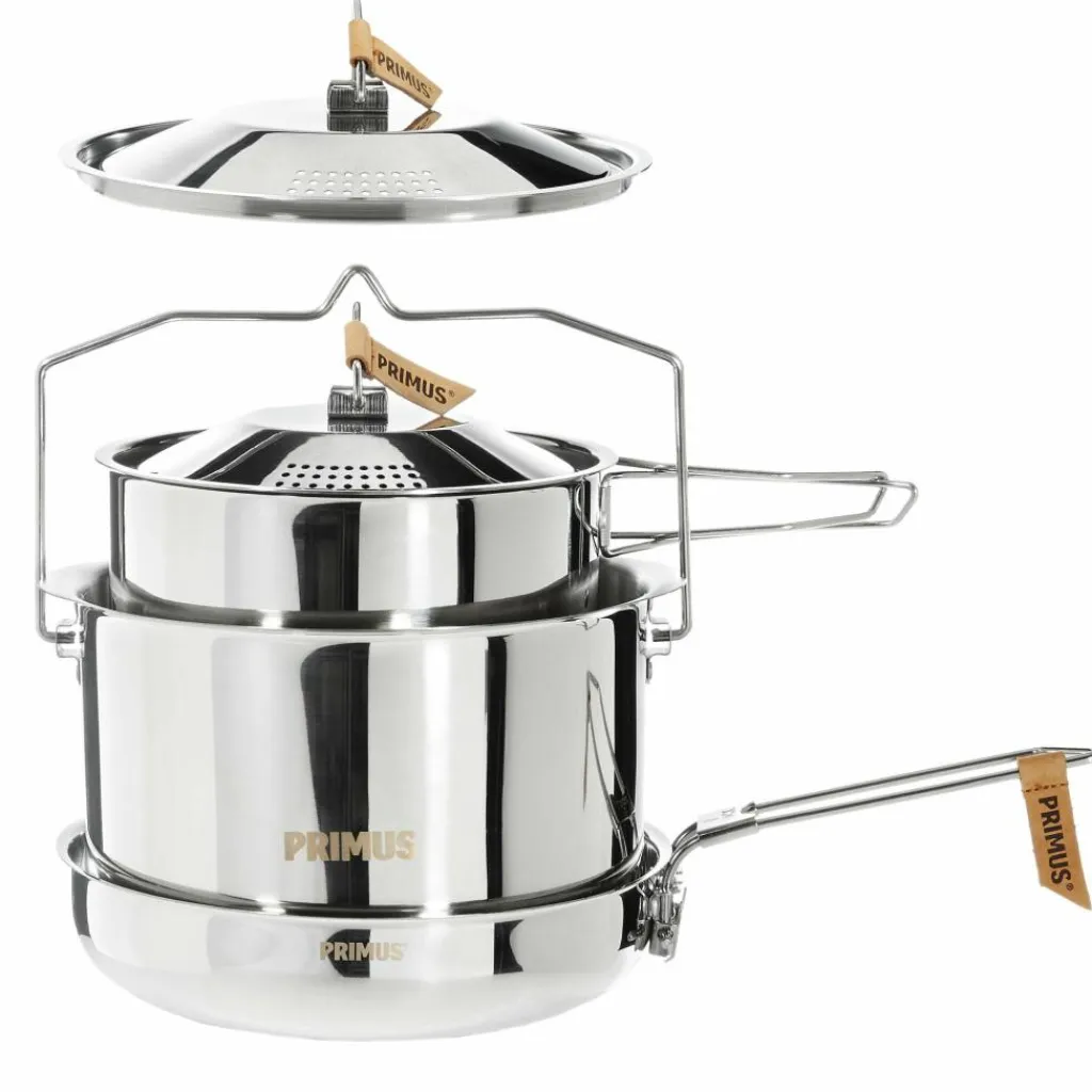 Dank einklappbarer Griffe aus Edelstahl und der Möglichkeit, alles ineinander zu stapeln, ist das Set auch moderat im Packmaß. Inklusive Aufbewahrungsbeutel.