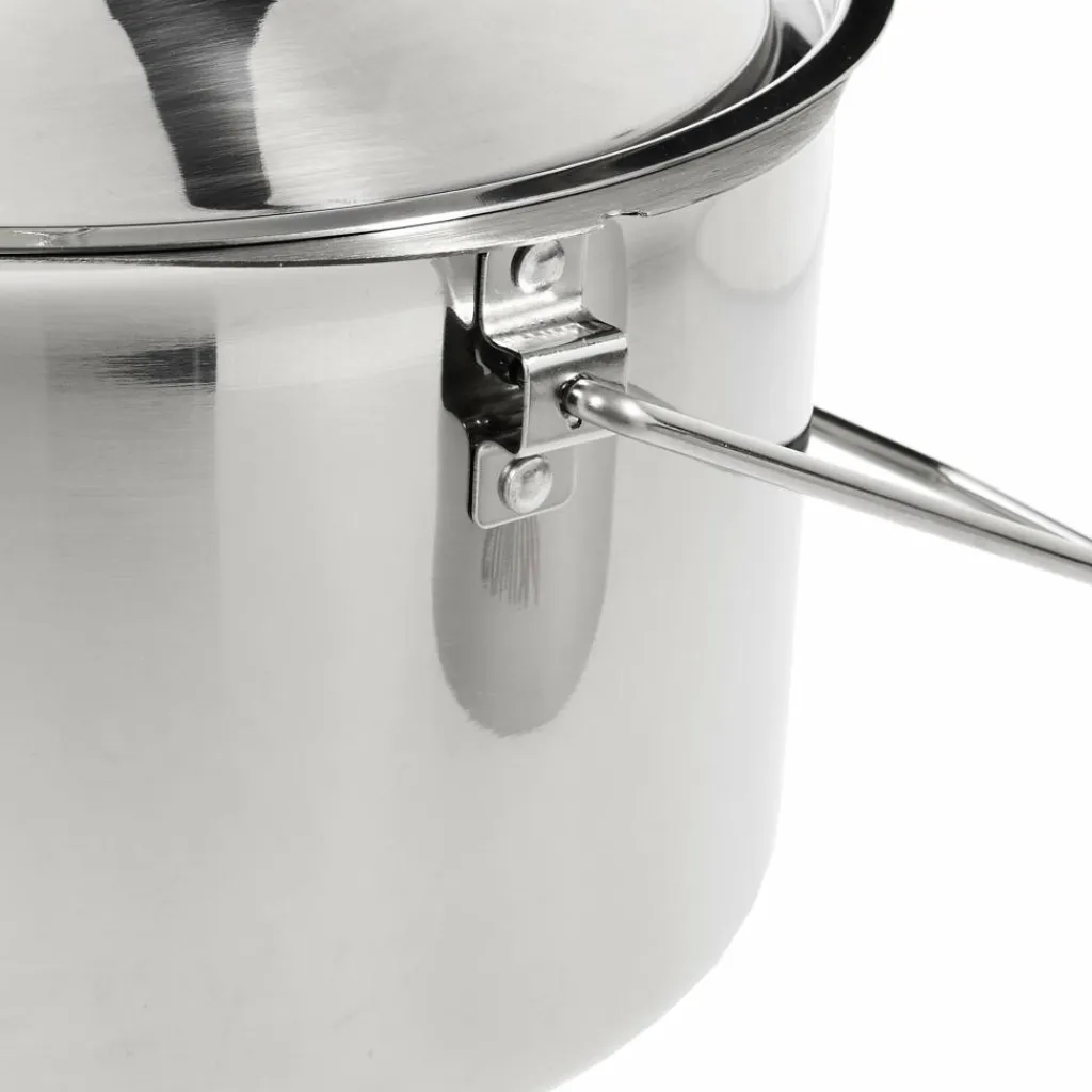 Das hochwertige Set aus Edelstahl besteht aus zwei Töpfen (1,8 und 3 l) mit Deckel und einer Pfanne mit 21 cm Durchmesser. Die Pfanne hat zur gleichmäßigen Erhitzung eine Aluminium-Einlage im Boden.