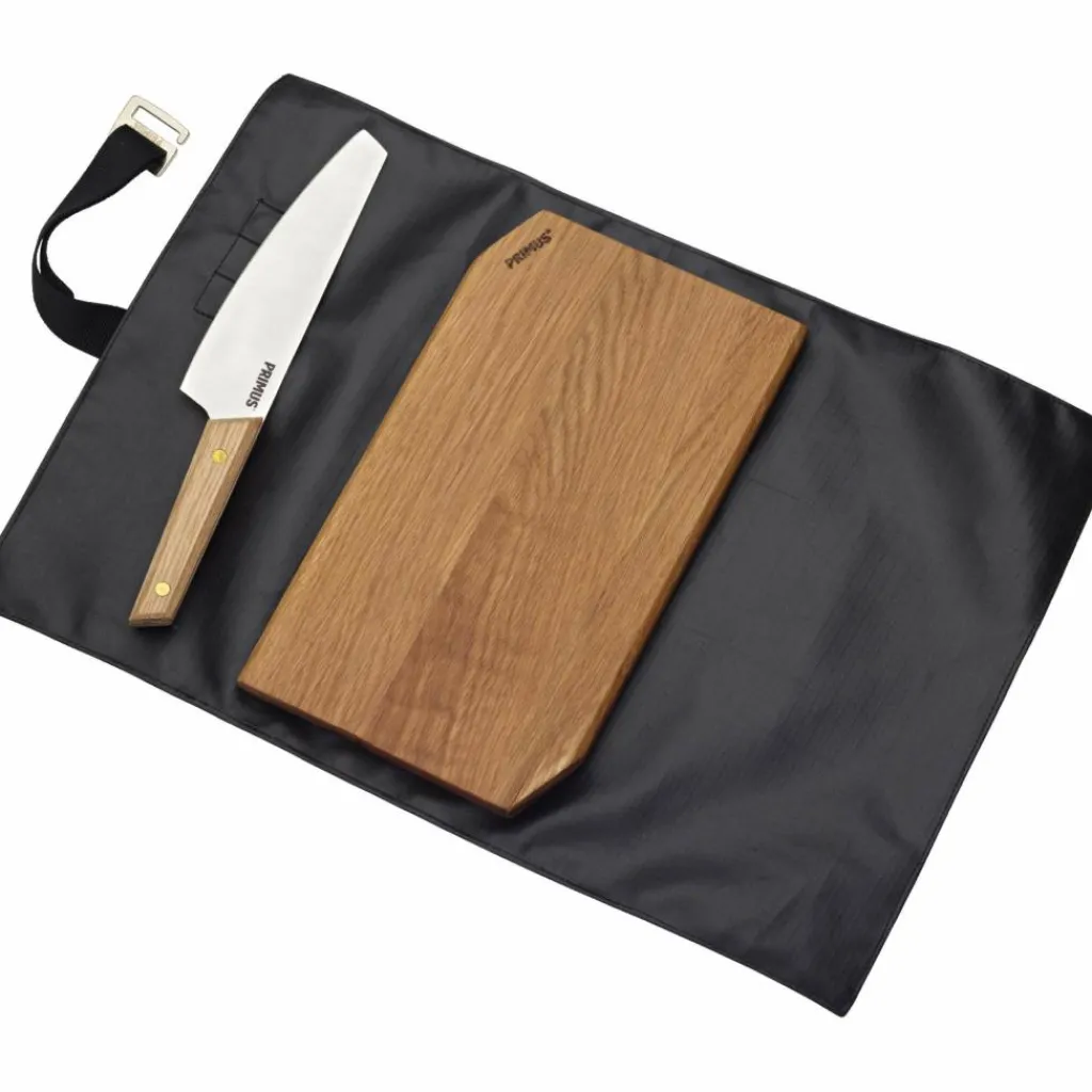 Sinnvolles und vor allem formschönes Zubehör fürs „Draußen-Kochen“: Die Wickeltasche beherbergt ein Schneidebrett aus duftendem Eichenholz und ein Schneidemesser mit rostfreier Edelstahlklinge.