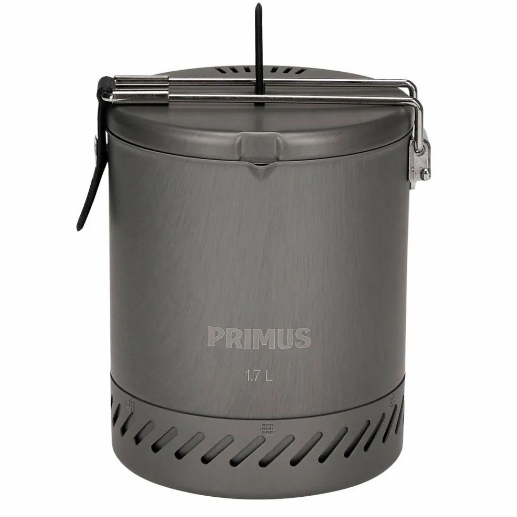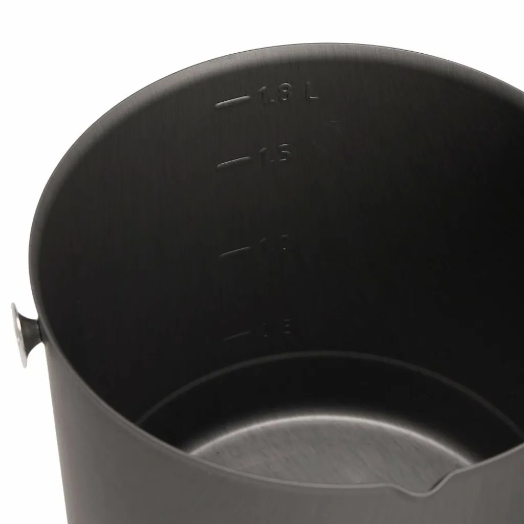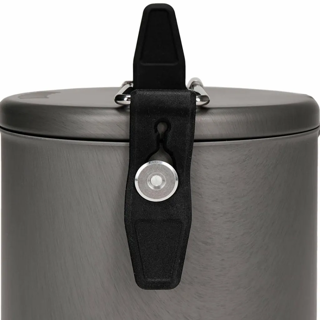 Der Brenner besitzt drei klappbare Beine, die für einen niedrigen Schwerpunkt und sicheren Stand sorgen. Seitlich des hartanodisierten Topfes befindet sich ein Wärmetauscher, der vorbeiströmende Wärme aufnimmt und die zur Verfügung stehende Hitze effizient an den Topf weitergibt. Ausgestattet ist er zudem mit einem Ausgießer, einem Klappgriff mit Isolierung und einem Deckel mit Siebfunktion zum Abgießen überschüssigen Wassers.