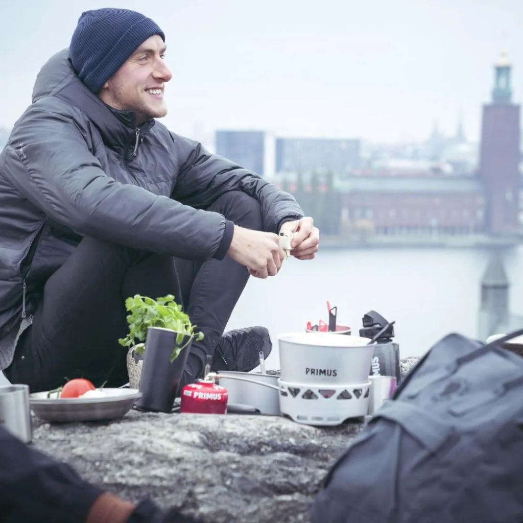 Der Kocher ist im Windschutz integriert und ist somit schnell einsatzbereit. Einfach aufstellen, Gaskartusche anschrauben und los geht das Vergnügen. Auf dem Windschutz stehen die Töpfe sicher und kippstabil.