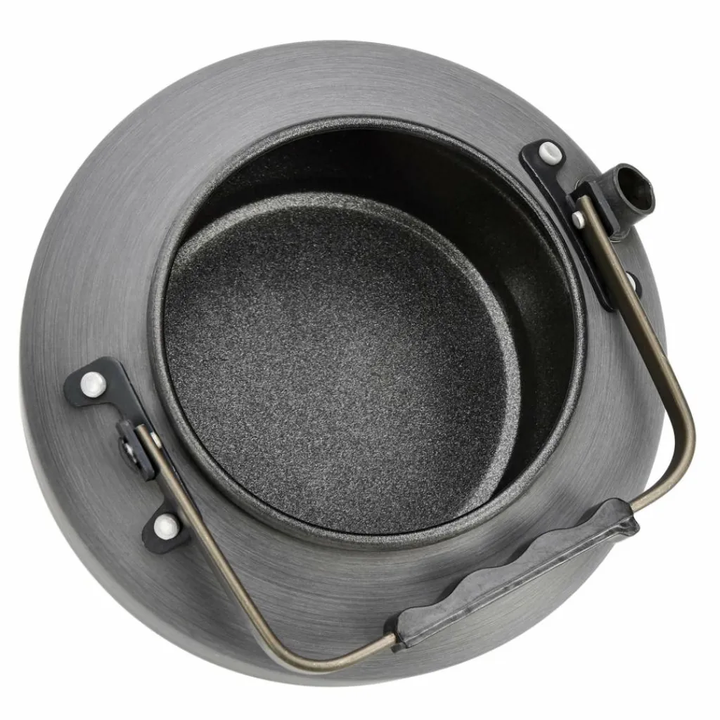 Der leichte Kessel besteht aus hart eloxiertem Aluminium und besitzt ein Fassungsvermögen von 0,9 Litern. Ein kunststoffumwickelter Griff verhindert Verbrennungen beim Hantieren.