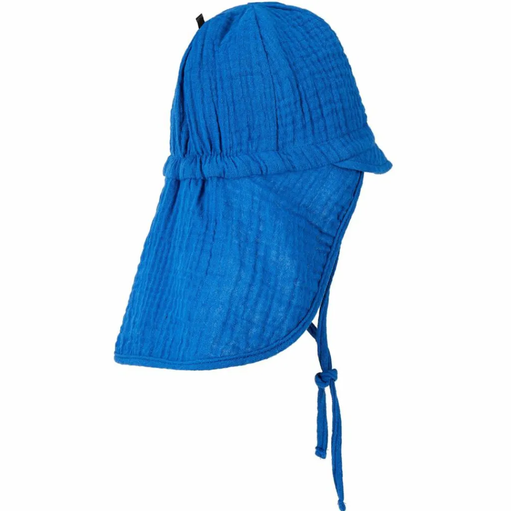 Durch die typische Musselin-Struktur ist der Sonnenhut angenehm weich, atmungsaktiv und saugfähig. Die für den Musselin-Stoff verwendete Baumwolle stammt aus kontrolliert biologischem Anbau. Der Schirm schützt das Gesicht vor blendender Sonne, während der lange Latz den Nacken und die Schultern bedeckt hält. Ein Gummizug am Hinterkopf sorgt für einen bequemen und sicheren Sitz. Das weiche Kinnband verhindert, dass der Hut bei windigem Wetter am Strand vom Kopf gepustet wird.