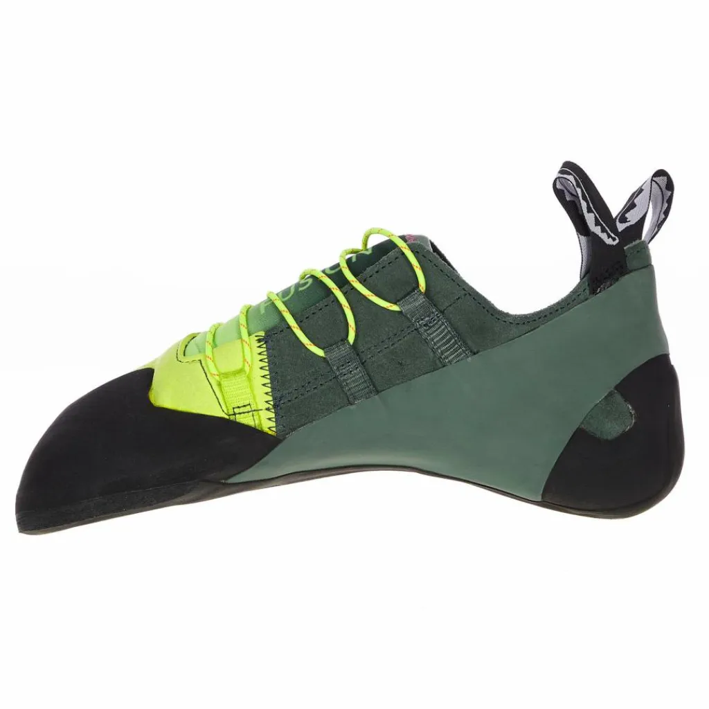 Auch der Leiste wurde komplett überarbeitet und ist jetzt mit einem etwas stärkeren Downturn versehen. Zudem hat die Zehenbox leicht an Volumen gewonnen. Die Ferse läuft relativ gerade, wodurch sich der Kletterschuh deutlich bequemer trägt. Die durchgehend konstruierte Sohle besteht aus einer hauseigenen, reibungsstarken Gummimischung, die eine sehr guten Kantenstabilität aufweist.