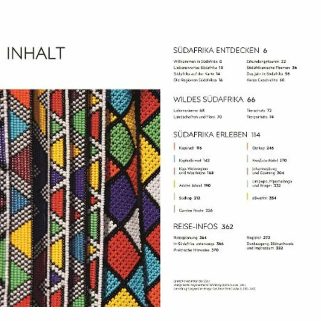 Ausgewählte Top-Themen: Auf den bildgewaltigen Themenseiten des Südafrika-Reiseführers stehen charakteristische Besonderheiten im Fokus. Entdecken Sie Südafrikas wilde Tierwelt, die politische Geschichte oder die Wunder der Natur – aber auch Outdoor-Abenteurer, Sportfans und Kunstfreunde kommen hier voll auf ihre Kosten.
