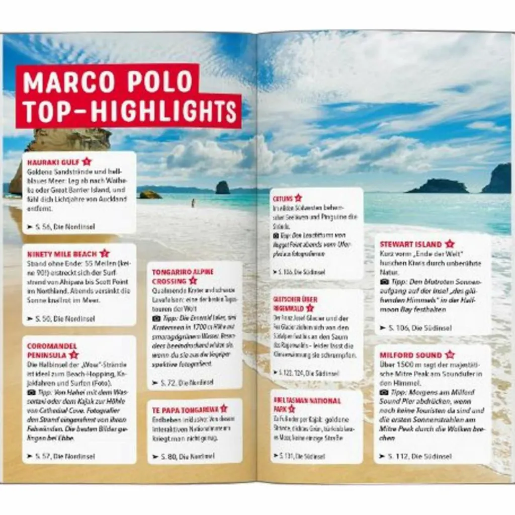 Magische Landschaften gilt es in Neuseeland zu entdecken: Von Gletscherzungen umrahmte Regenwälder, geheimnisvolle Fjorde und tiefe Seen, faszinierende Vulkane, mächtige Farne oder weiße Sandstrände: Auf den beiden Inseln im Südwestpazifik erwartet dich ein überwältigendes Naturerlebnis. Ob Aktivurlaub, kulinarische Entdeckungsreise oder Chillen am Strand: Mit dem Marco Polo Reiseführer Neuseeland verpasst Du nichts!