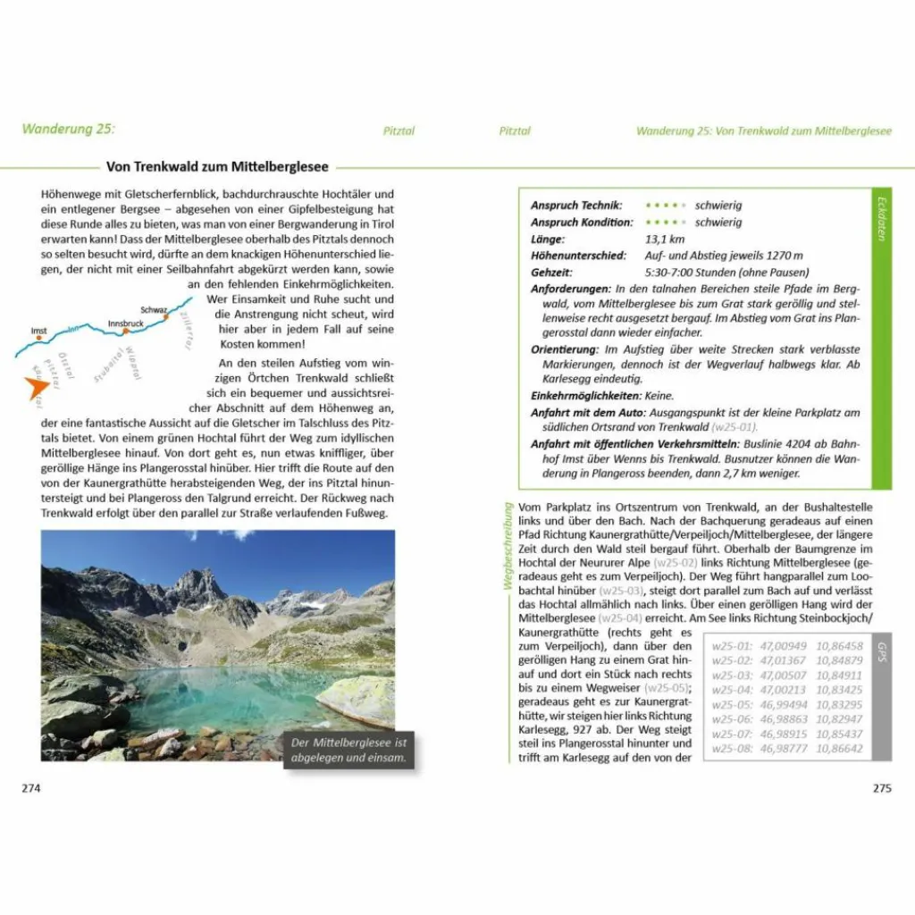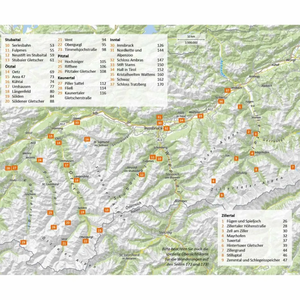 Südlich des Inns ziehen sich langgestreckte Täler in die Hochgebirgswelt des Alpen-hauptkamms hinein: Zillertal, Stubaital, Ötztal, Pitztal und Kaunertal zählen zu den schönsten Tälern der österreichischen Alpen – durchrauscht von klaren Bächen, umgeben von grünen Almwiesen und überragt von eisgekrönten Gipfeln. Im nahen Inntal laden die Landeshauptstadt Innsbruck, malerische Kleinstädte, romantische Schlösser und prunkvolle Kirchen zu einem Ausflug ein.Dieses Buch stellt alle interessanten Ortschaften und Ausflugsziele im Zillertal, Stubaital, Ötztal, Pitztal und Kaunertal mit vielen Fotos und Hintergrundinformationen vor, dazu die Stadt Innsbruck sowie alle kulturellen Sehenswürdigkeiten des Inntals. Die 32 schönsten und erlebnisreichsten Wandertouren der Region werden ausführlich beschrieben. Ein differenziertes Bewertungssystem gibt Auskunft über die Anforderungen, topografische Detailkarten und GPS-Daten bringen Sie auf den richtigen Weg. Mit den herausnehmbaren Tourenblättern haben Sie alle wichtigen Informationen unterwegs immer griffbereit!