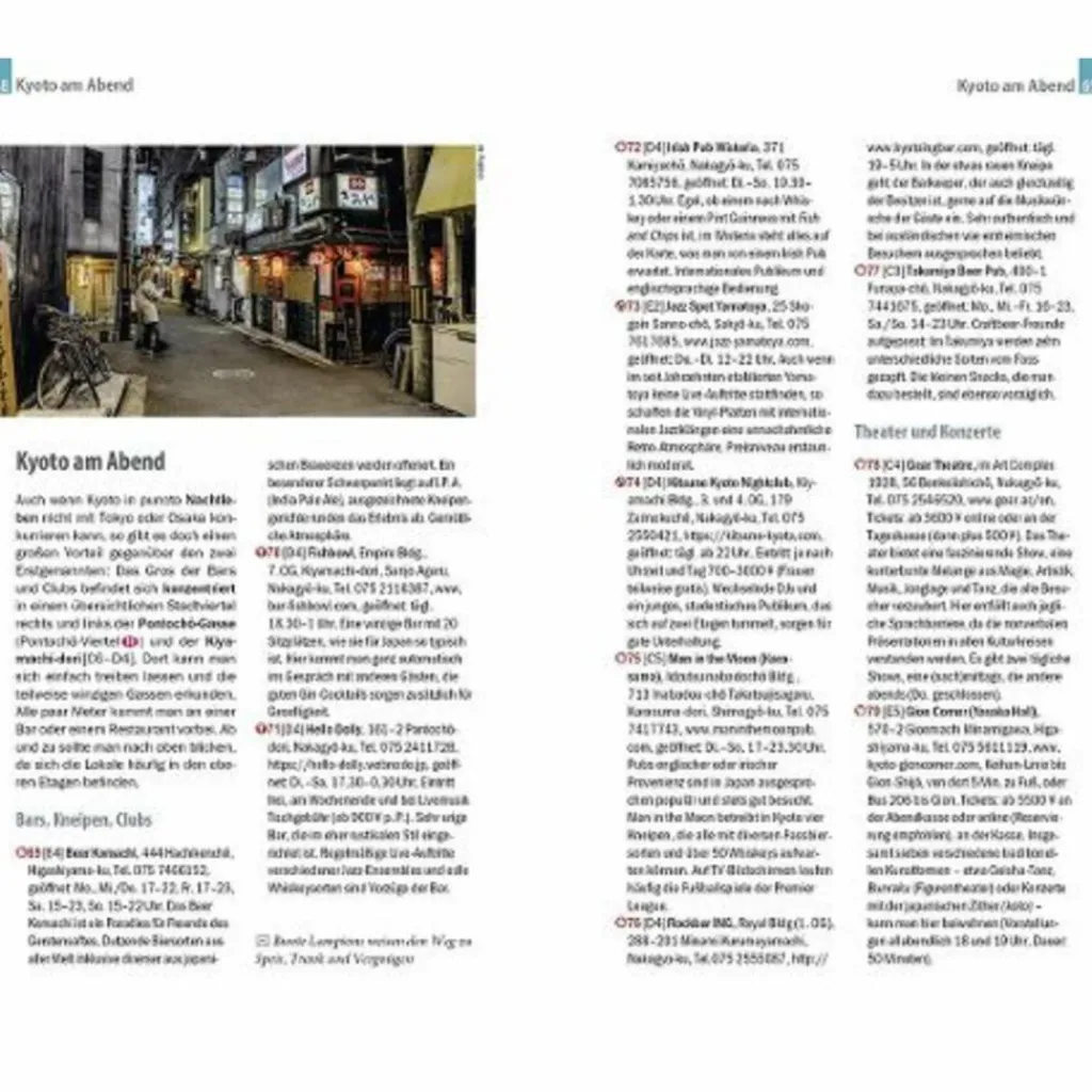 Die wichtigsten Sehenswürdigkeiten und Museen der Stadt sowie weniger bekannte Attraktionen und Viertel ausführlich vorgestellt und bewertet – Faszinierende Architektur: schintoistische Schreine, royale Paläste und moderne Großstadtbauten – Abwechslungsreicher Stadtspaziergang – Erlebnisvorschläge für einen Kurztrip – Ausflüge nach Arashiyama, zum Berg Kurama und nach Kibune – Shoppingtipps vom 100-Yen-Shop bis zur edlen Spezialmanufaktur – Die besten Lokale der Stadt und allerlei Wissenswertes über die japanische Küche – Tipps für die Abend- und Nachtgestaltung: vom Kabuki-Theater bis zum angesagten Club – Von der Izakaya bis zum Kobe-Rind: japanische Sake- und Speisekultur – Kyoto zum Durchatmen: spirituelle Zen-Tempel, bezaubernde Gartenanlagen und eine entspannende Teezeremonie – Ausgewählte Unterkünfte von preiswert bis ausgefallen