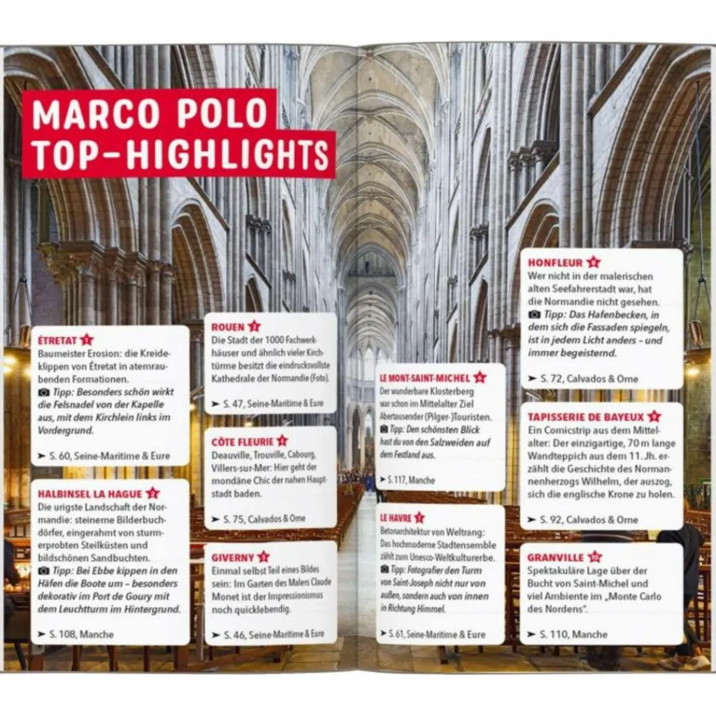 Mit deinem Marco Polo Reiseführer bist du ohne große Vorbereitung bestens für jedes Abenteuer gerüstet. Ob du den Erlebnistouren entlang der Alabasterküste folgst, auf eigene Faust durch Bilderbuch-Fachwerkdörfer schlenderst oder das Geburtshaus von Christian Dior besuchst – dein Marco Polo Reiseführer Normandie gibt dir die besten Tipps und lässt dich nie die Orientierung verlieren.