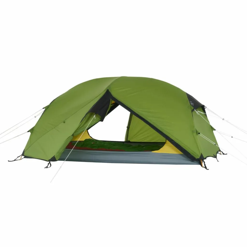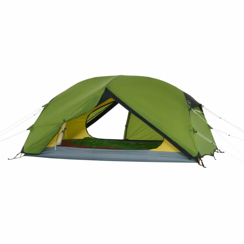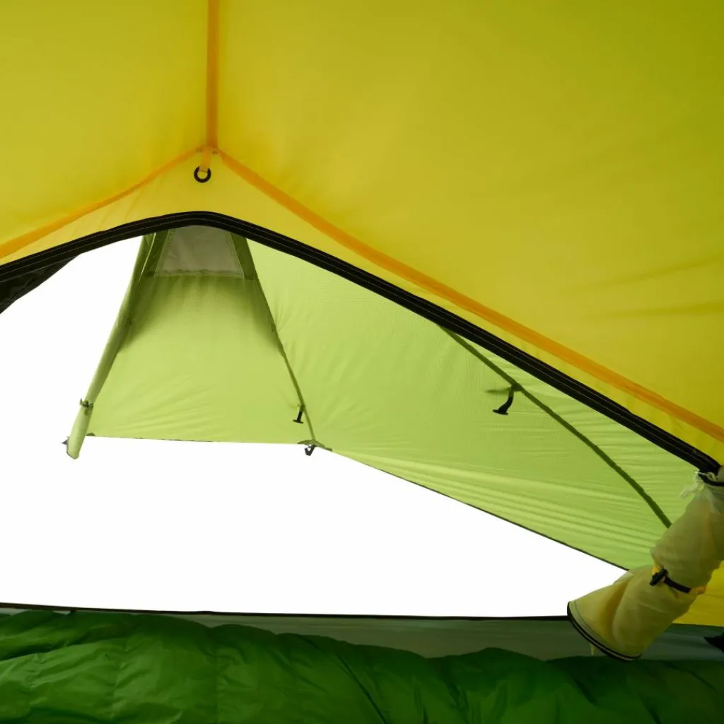 Durch das Gestänge mit hoch angesetzten Kreuzpunkten werden der Fuß- und Kopfbereich weit aufgespannt, was steile Seitenwände erzeugt. Ein zusätzlicher Querbogen im Kuppelbereich spannt das Innenzelt weiter auf und schafft zusätzlichen Platz im Kopfbereich. So bietet das Innenzelt viel Bewegungsfreiheit.