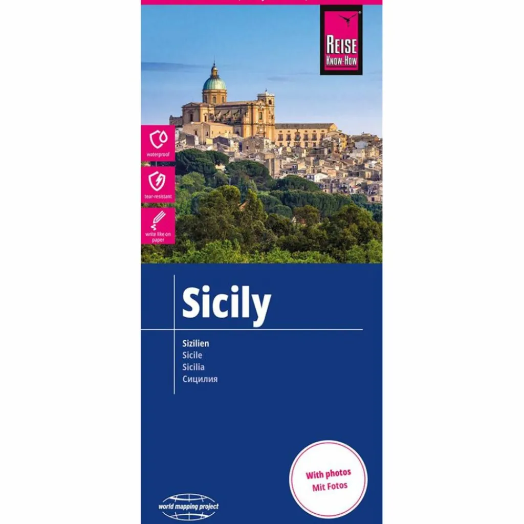 Hochreißfeste und 100% wasserfeste Landkarte „Sizilien“ aus der Serie world mapping project. Reise Know-How Landkarten zeichnen sich durch besonders stabiles Kunststoffpapier aus, das beschreibbar ist wie Papier, sogar mit Bleistift. Der Pappumschlag ist abnehmbar, so dass sich die Karte bequem in jede Tasche stecken lässt. Eine Schutzhülle ist nicht erforderlich. Die kartografische Darstellung konzentriert sich auf die wichtigsten Informationen für Reisende und ist besonders gut lesbar. Statt einer Schummerung werden farbige Höhenschichten verwendet.