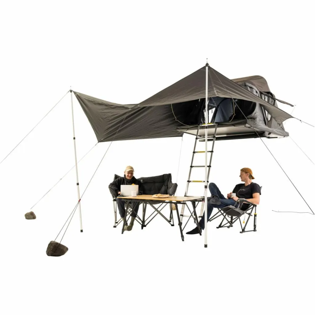 Mit einer Wassersäule von 3.000 mm bietet die Markise zuverlässigen Schutz auch bei Dauerregen. Selbstverständlich ist auch die Verbindung zum Dachzelt wasserdicht. Durch solides Abspannen sowie die Fixierung der Reißverschlüsse am Dachzelt bleibt die Markise auch bei Wind stabil. So kannst du den Ausblick genießen oder dich rundherum vor Regen schützen – je nach Wetterlage.
