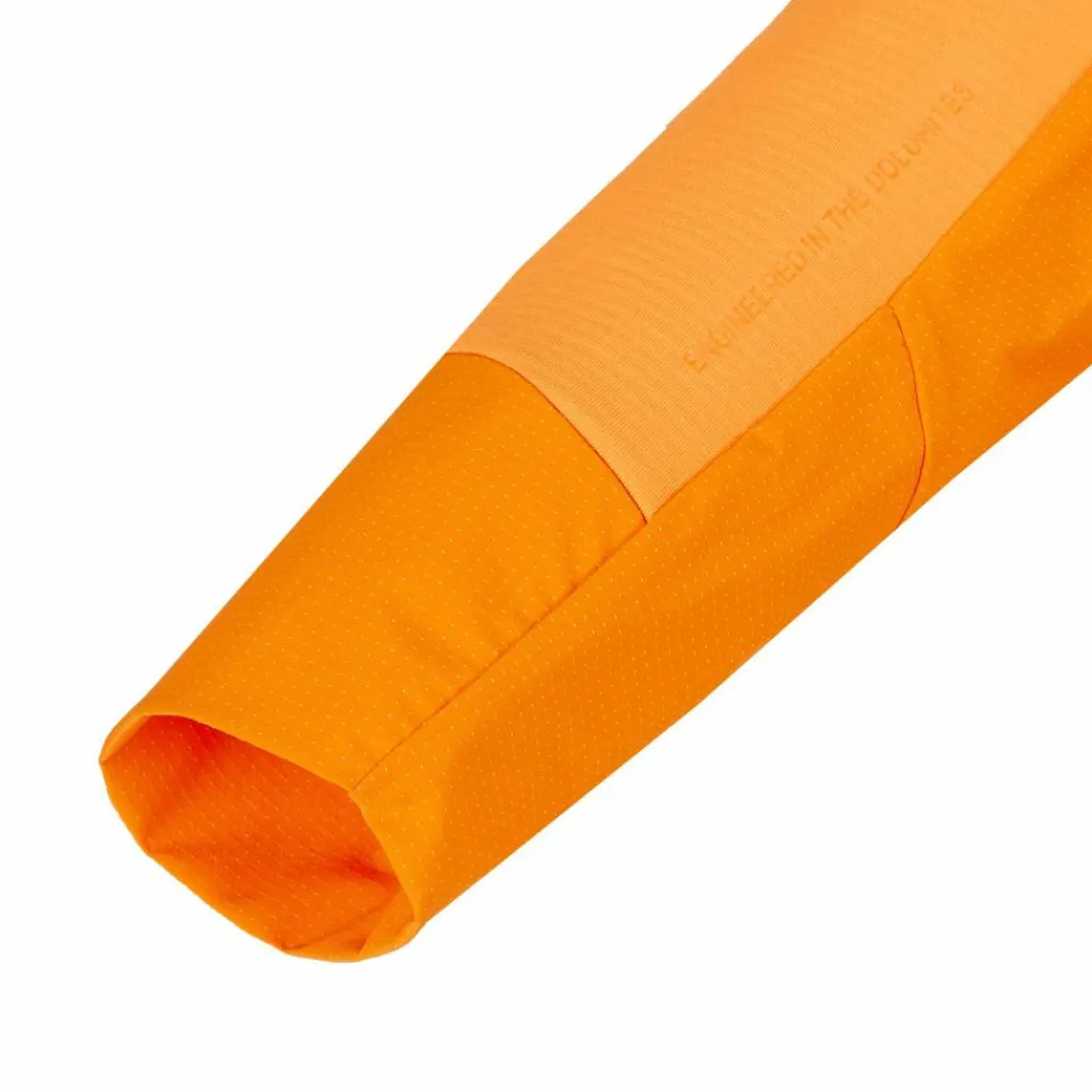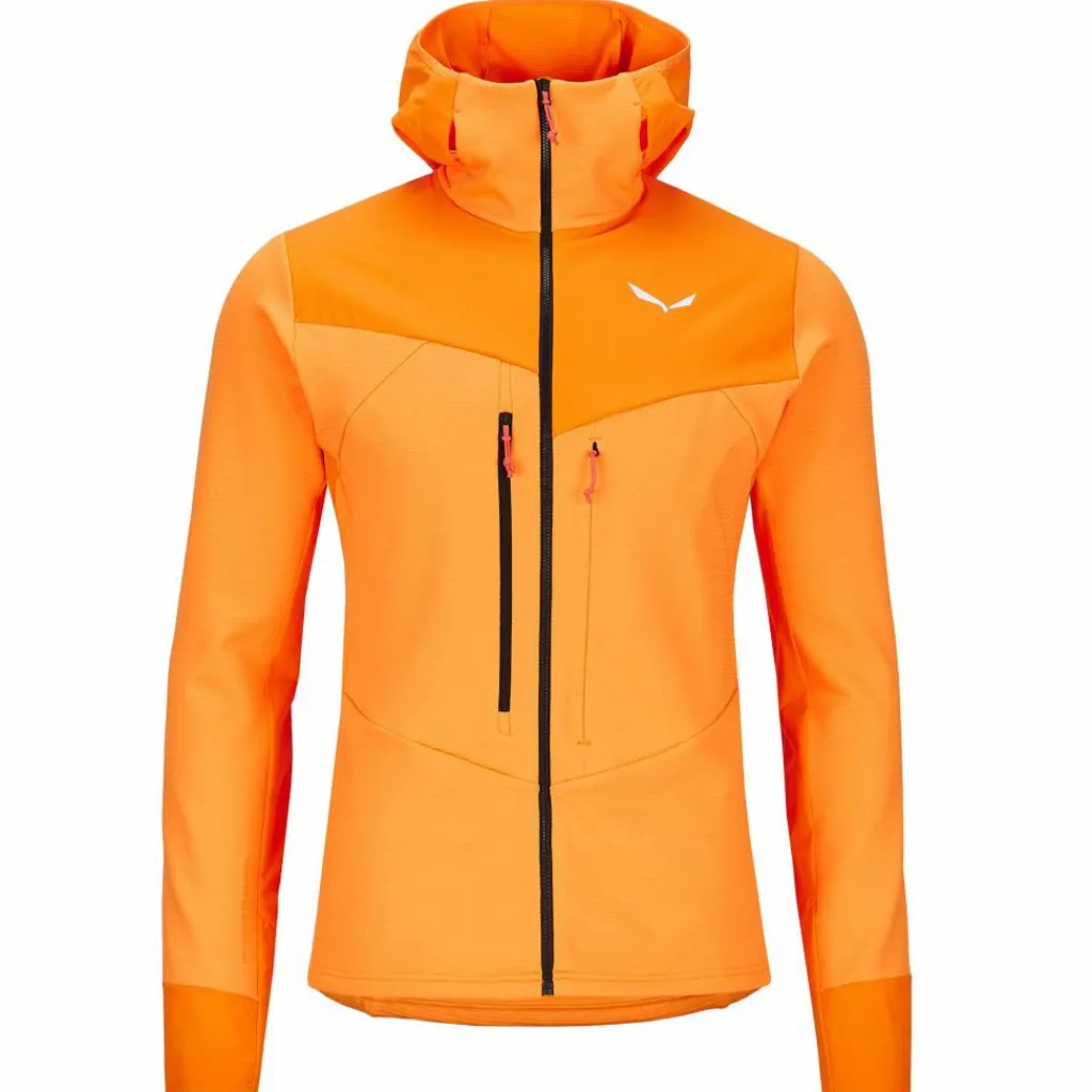 Die Kapuze ist mit zwei seitlichen Öffnungen ausgestattet, durch die du die Gurtriemen des Kletterhelms ziehen kannst. Das sorgt für einen sicheren Sitz des Helms, während Kopf, Hals und Ohren gut vor Wind und Kälte geschützt bleiben. Die beiden Brusttaschen mit Reißverschluss bieten viel Platz für Smartphone, Topo und Co. und sind so angebracht, dass sie auch mit angelegtem Klettergurt problemlos zu erreichen sind.