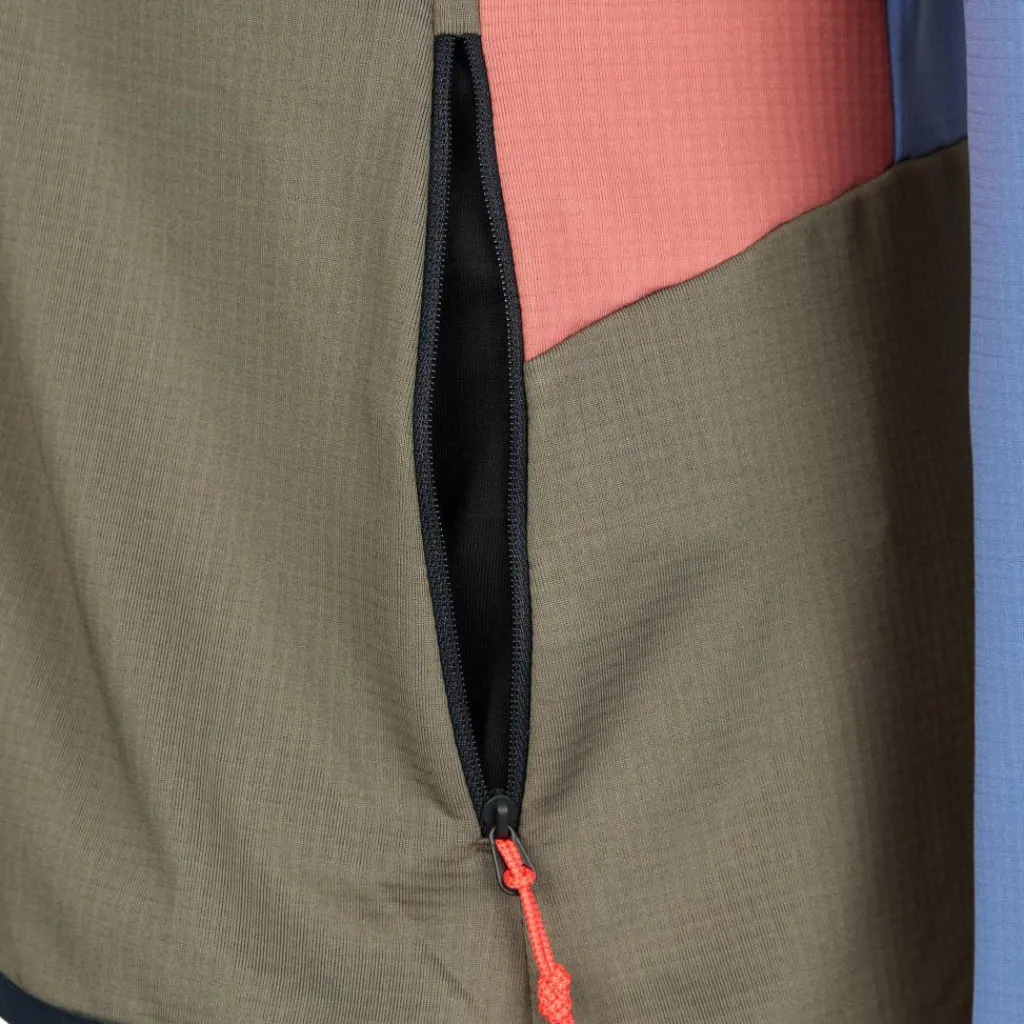 Ein hoher Kragen, elastische Saum- und Ärmelabschlüsse, versetzte Schulternähte sowie zwei Reißverschlusstaschen machen die Jacke zu einem funktionalen Midlayer für den Einsatz am Berg.