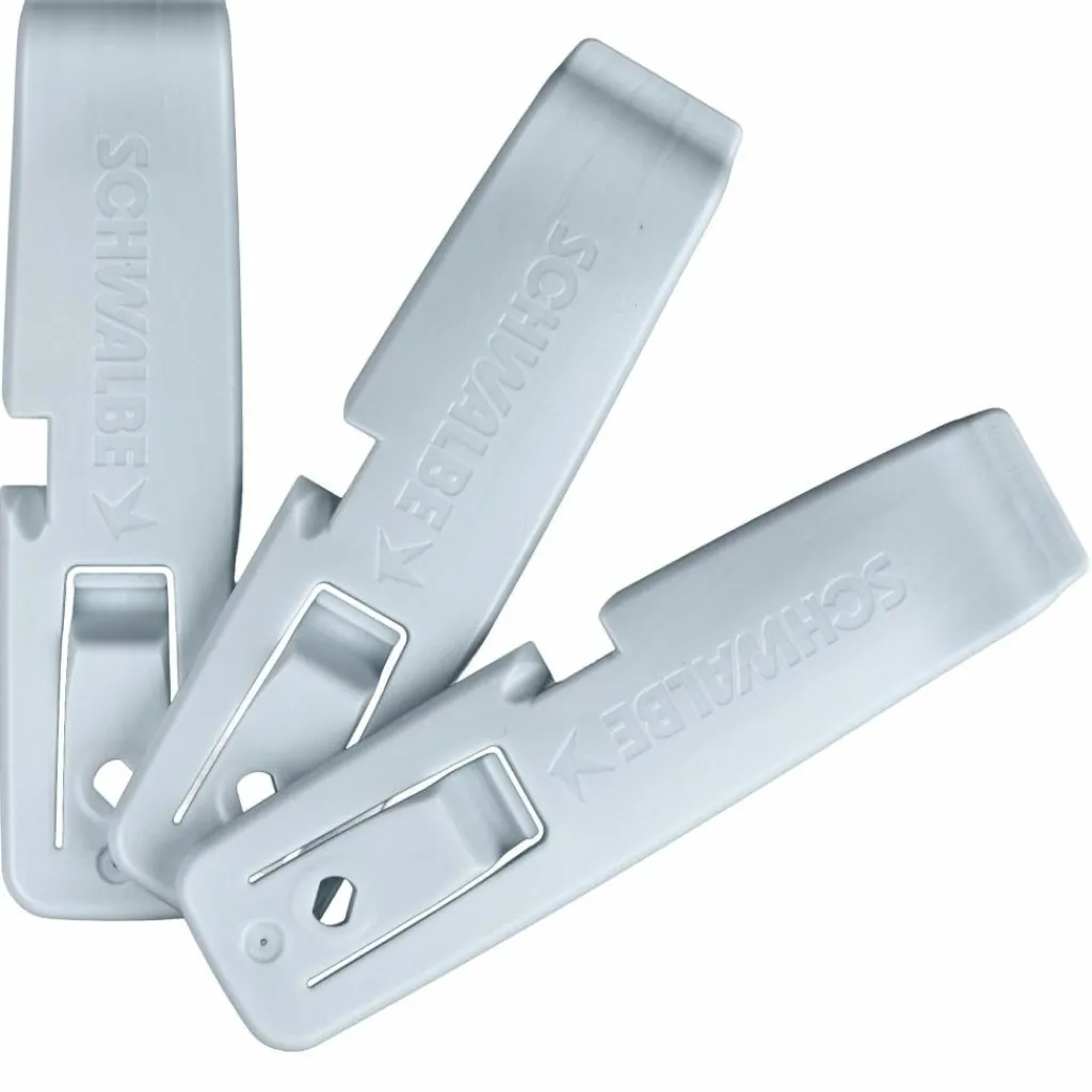 Bei der Montage deines Reifens kannst du die Reifenheber an den Stellen des Felgenhorns anclipsen, an denen der Reifen schon montiert ist. Damit sicherst du den bereits montierten Bereich der Reifenwulst. Die Wulst rutscht dann nicht mehr heraus. Und du kannst in aller Ruhe den letzten Abschnitt des Mantels über das Felgenhorn hebeln.