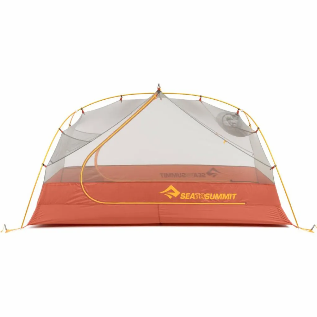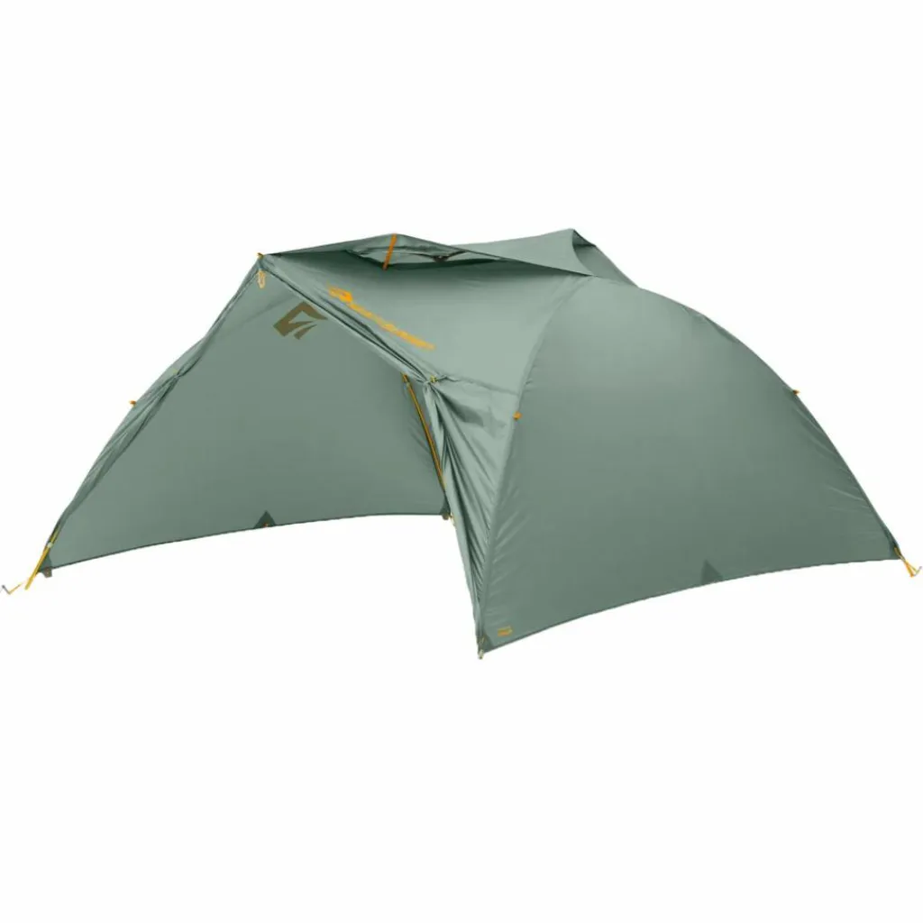 Die Form der Haken erlaubt es zudem, das Gestänge direkt am Außenzelt zu befestigen und dieses ohne Innenzelt zu nutzen. Zwei Hypalon-Schlaufen ermöglichen in dieser Variante das Aufstellen als Unterstand, unter dem mehrere Personen bequem sitzen können. So entsteht eine wetterfeste Unterkunft, in der gemeinsames Abendessen oder geselliges Beisammensein möglich ist. Wenn es Zeit ist, in den Schlafsack zu kriechen, hängst du das Innenzelt ein und klappst das Außenzelt nach unten.