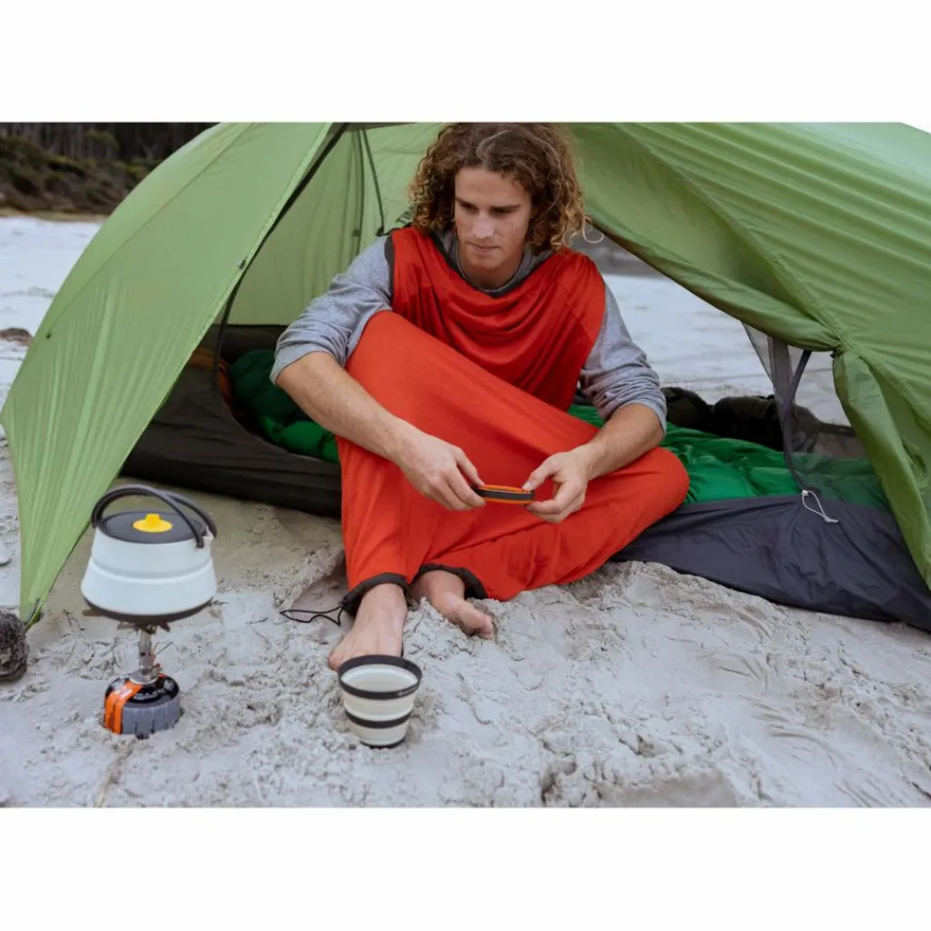 Sehr leichter Wasserkessel mit 1,3 l Volumen, der sich dank seiner Silikonwände flach zusammenfalten lässt. Deckel und Boden bestehen aus ultraleichtem Aluminium.