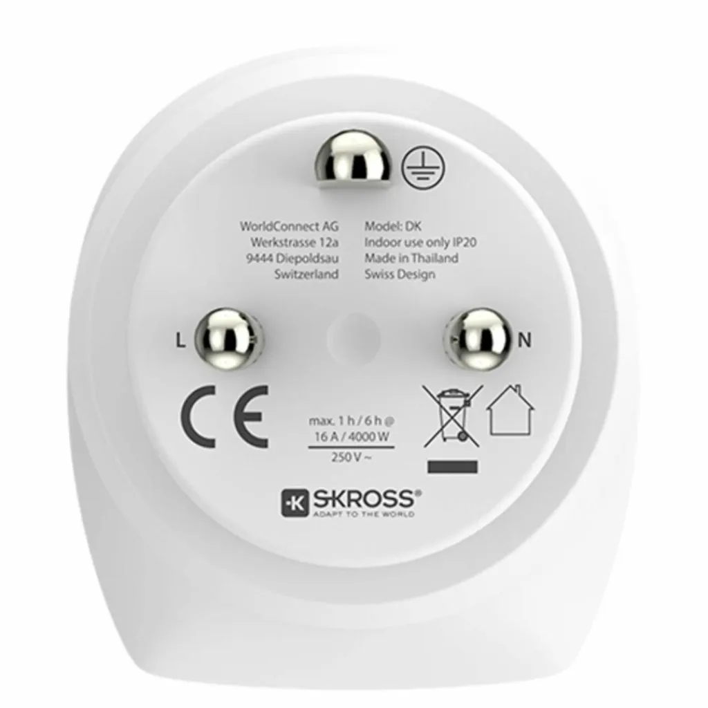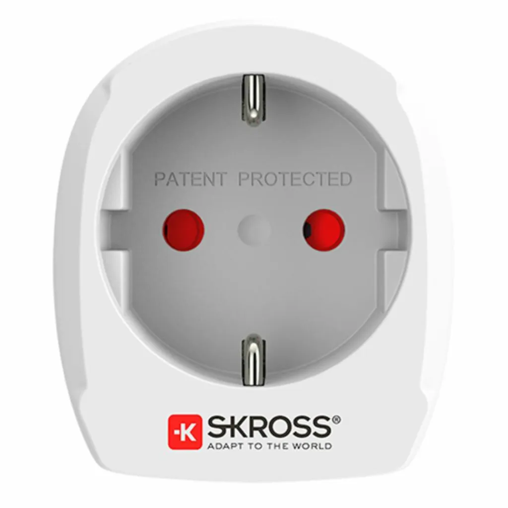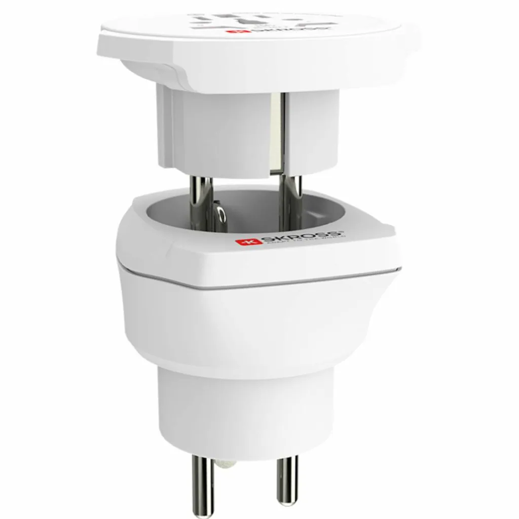 Reisestecker für Reisen in Dänemark und in Länder mit Schuko-Standard. Der Einsatz erlaubt das Anschließen unterschiedlicher Steckertypen weltweit.