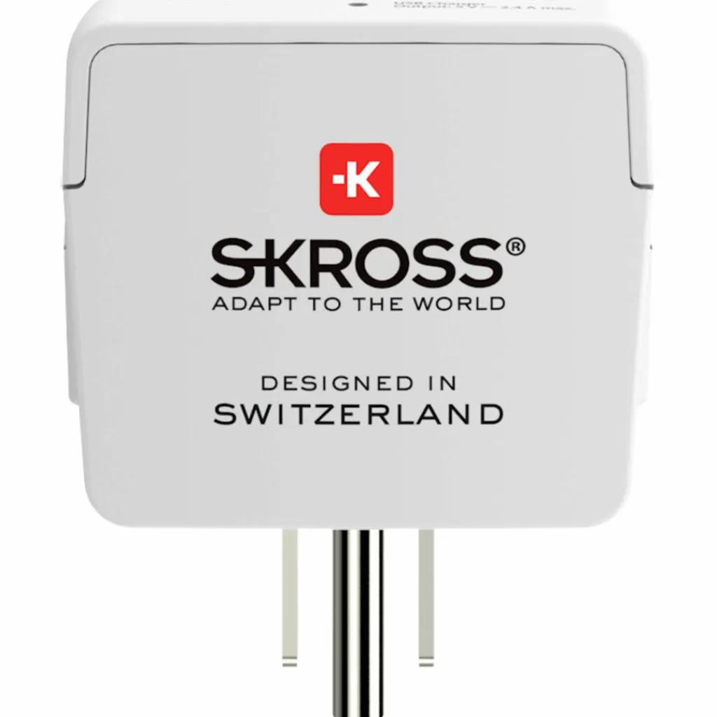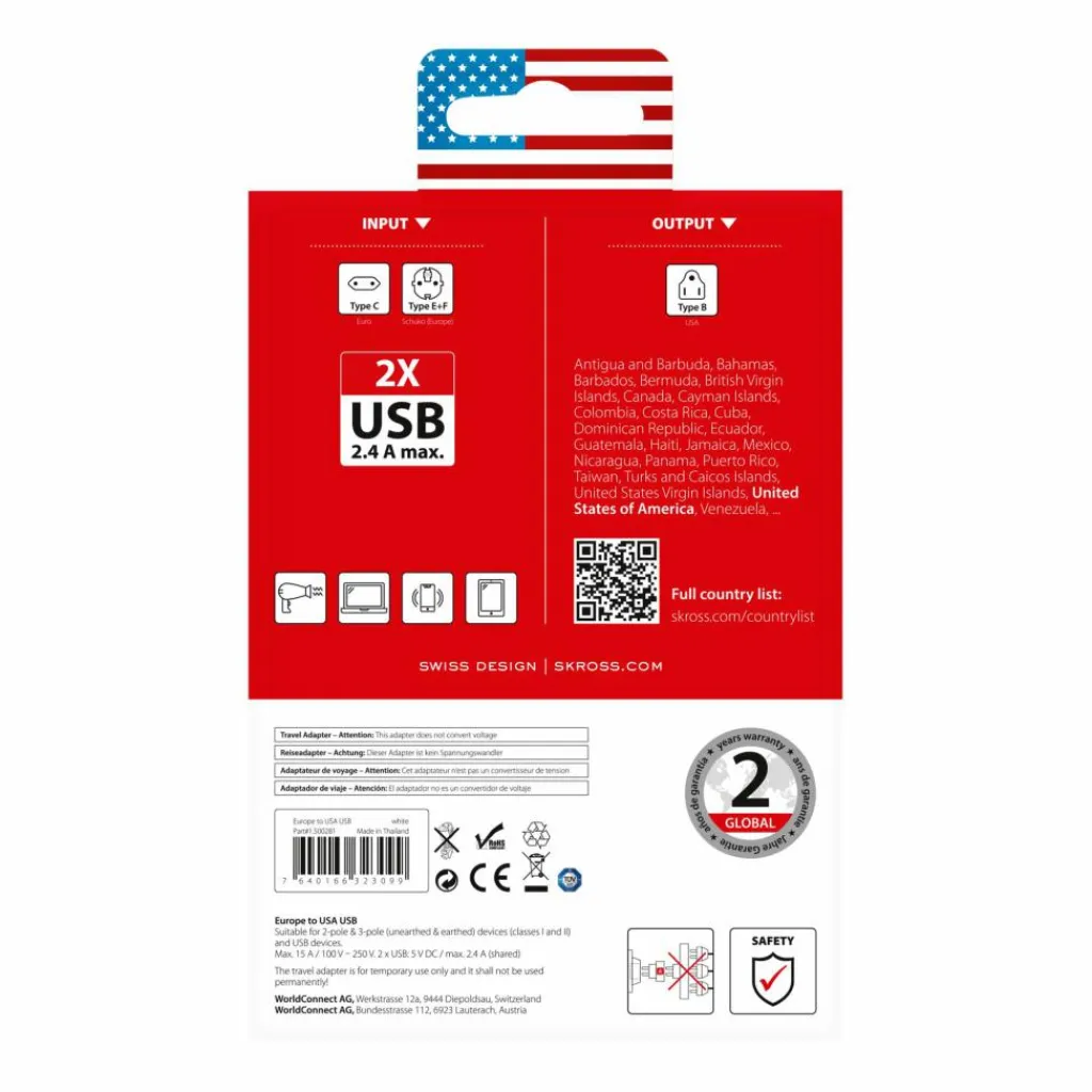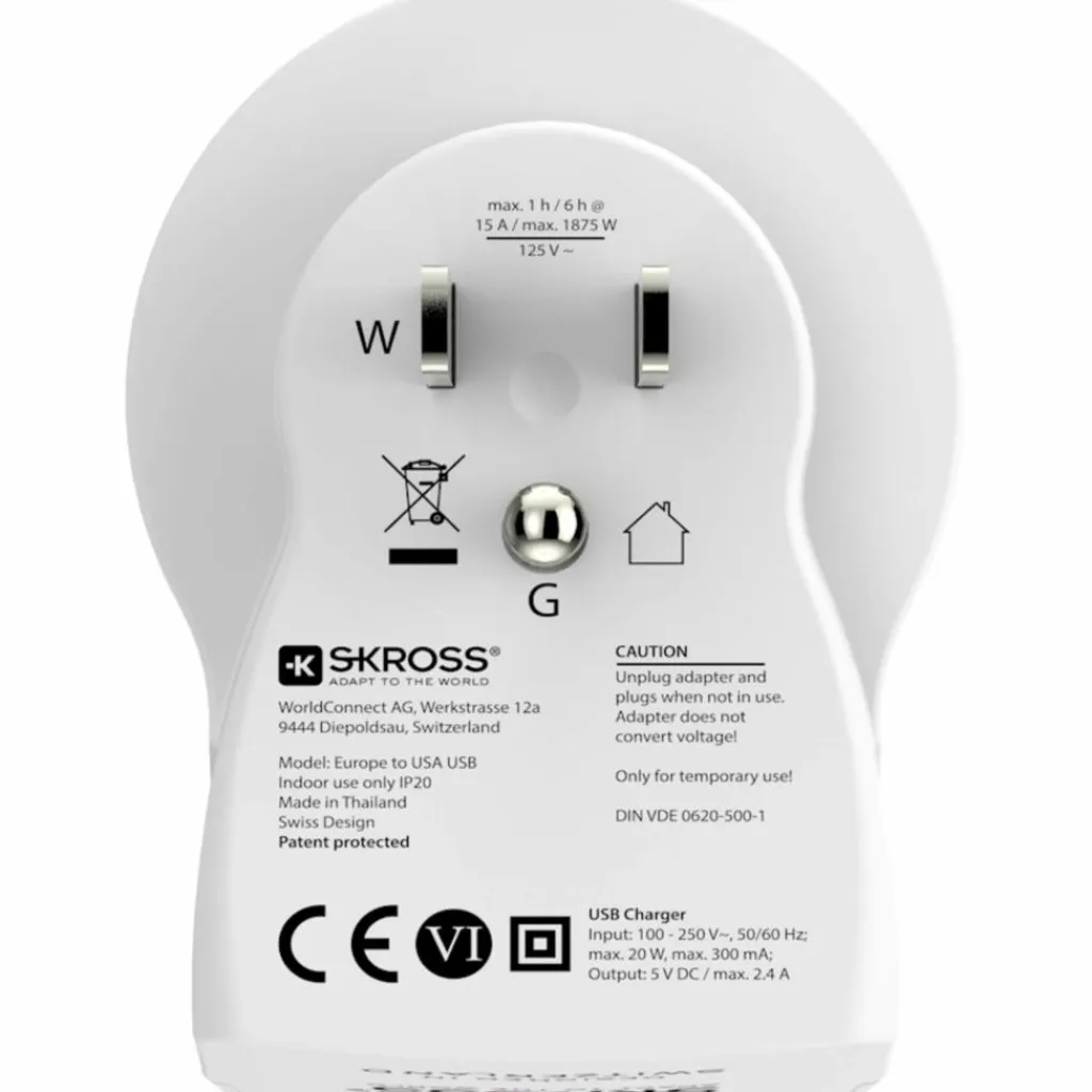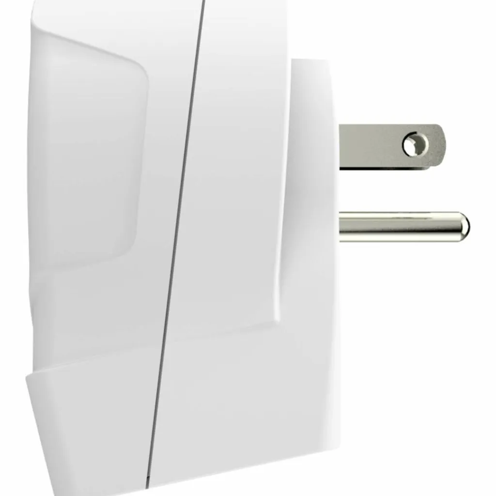 Reisestecker für einen Trip in die Vereinigten Staaten von Amerika und Kanada. Mit Anschlüssen für einen Netzstecker und zwei USB-Geräte. So sind Notebook, Kamera und Smartphone schnell geladen.