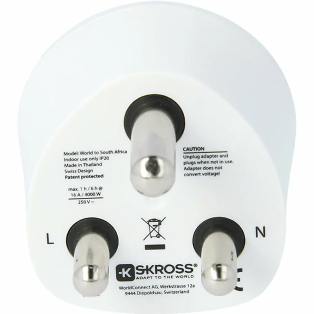 Reisestecker für Reisen nach Südafrika und alle Länder mit südafrikanischem Standard. Der Einsatz erlaubt das Anschließen unterschiedlicher Steckertypen weltweit.