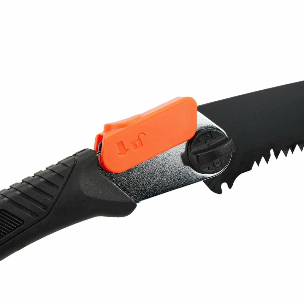 Die Säge ist am Griffrücken mit einer Sicherung ausgestattet, die das Aus- oder Einklappen der Klinge erst nach dem Drücken ermöglicht. Wird die Klinge ausgeklappt, arretiert sie automatisch, um beste Sicherheit während der Arbeit zu gewährleisten. Der große Kunststoffgriff ist mit rutschfesten Querrillen versehen und am Ende mit einer Fangriemenöse ausgestattet. Dadurch kannst du eine Kordel zur zusätzlichen Sicherung anknoten.