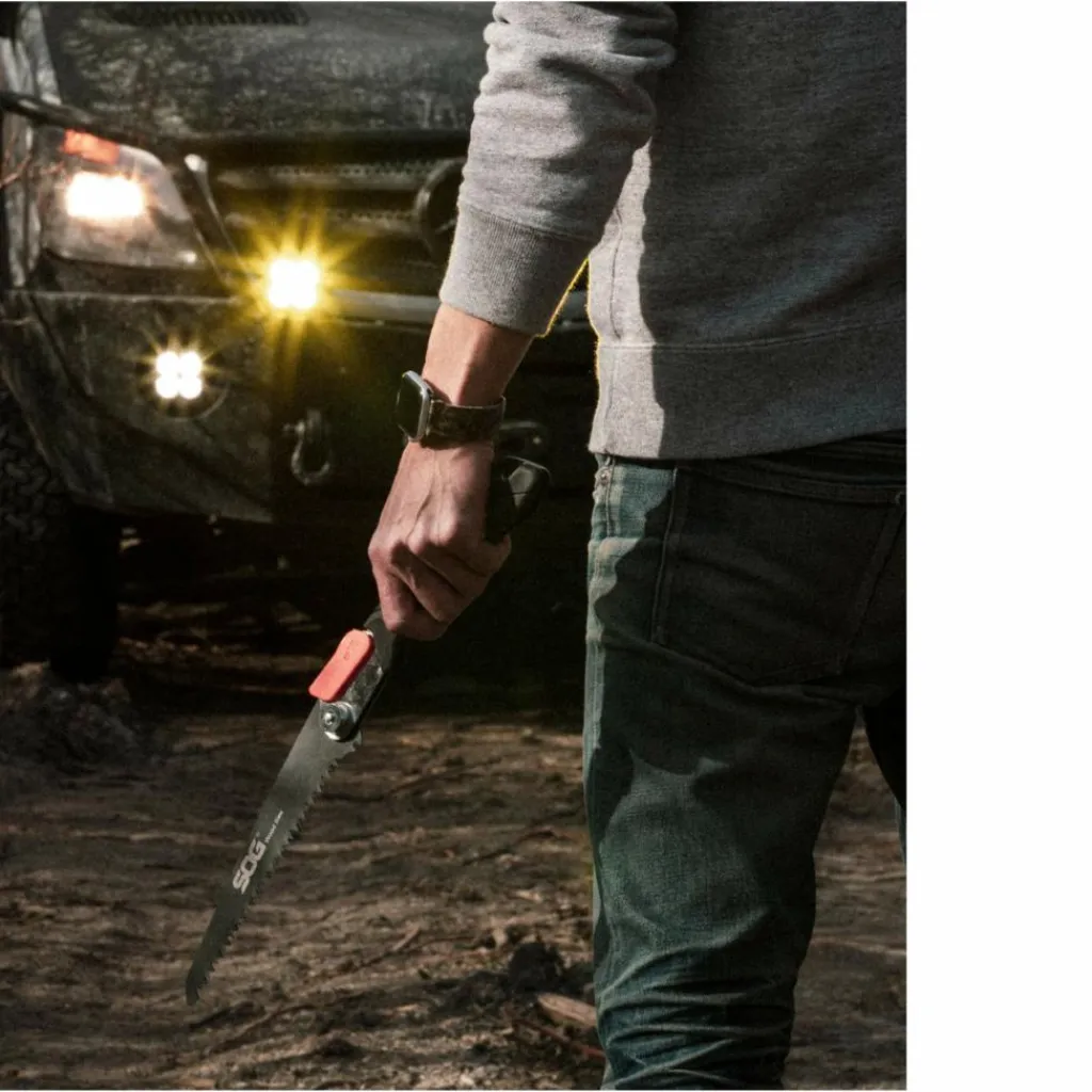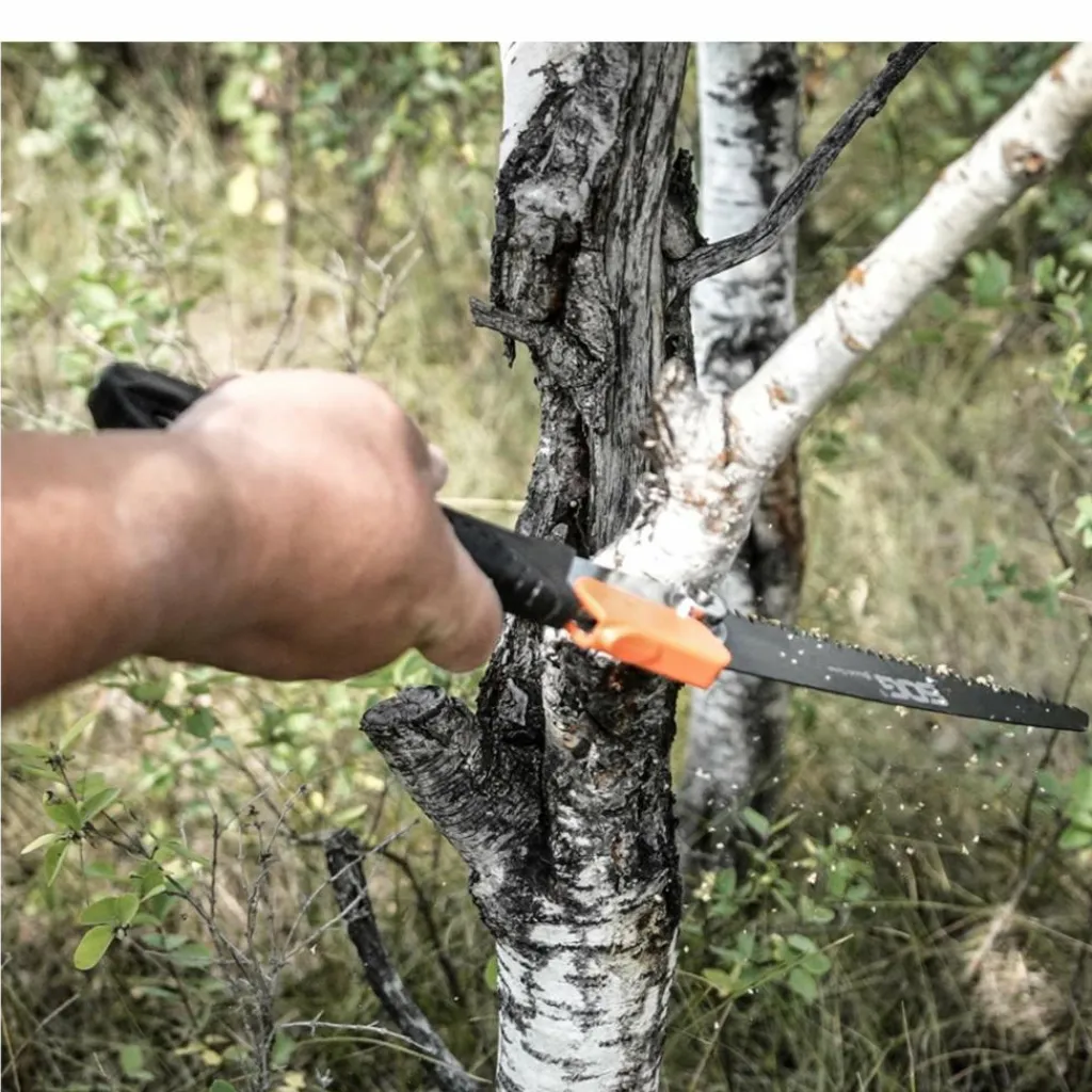 Die SOG Klappsäge bietet mit einer Länge von 44 cm eine gute Balance zwischen Nutzbarkeit und Verstaubarkeit. Ihre 21 cm lange, gehärtete Sägeklinge eignet sich zum Sägen von Ästen und kleinen Stämmen.