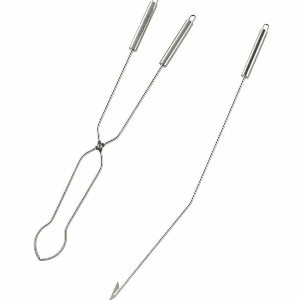 Nachlegen und im Lagerfeuer stochern gelingt mit diesen 93 cm langen Werkzeugen aus Edelstahl sicher und stilvoll.
