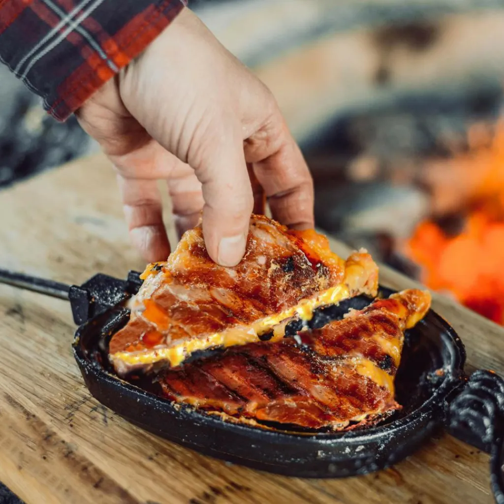 Der Sandwichmaker aus Stahl eignet sich für hohe Temperaturen und bereitet leckere Sandwiches direkt auf dem Lagerfeuer zu. Verziert wird das Sandwich mit einem Elchmotiv!