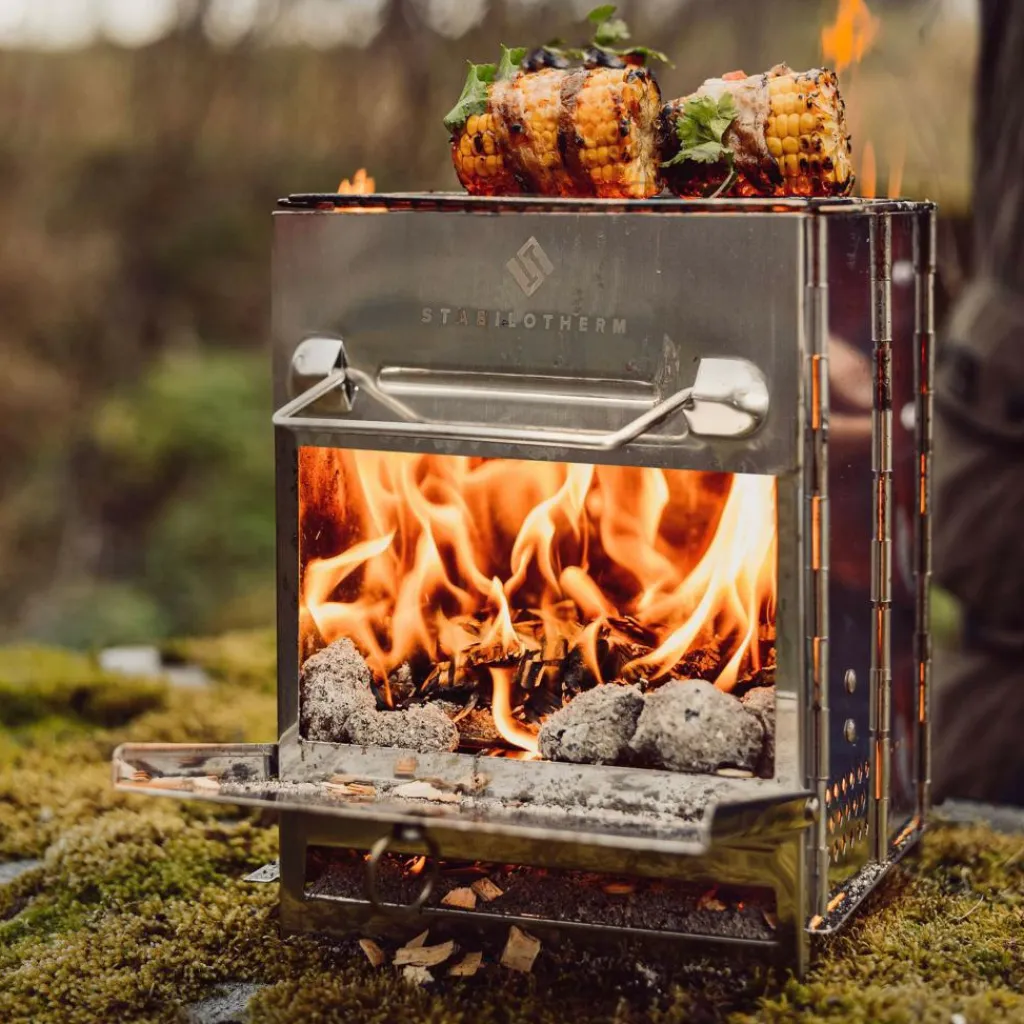 Besonders großer Holzkocher, der sich platzsparend zusammenfalten lässt und damit gut für Roadtrips eignet. Auf ihm lassen sich in Eisenpfannen und Kesseln Gerichte für mehrere Personen zubereiten.