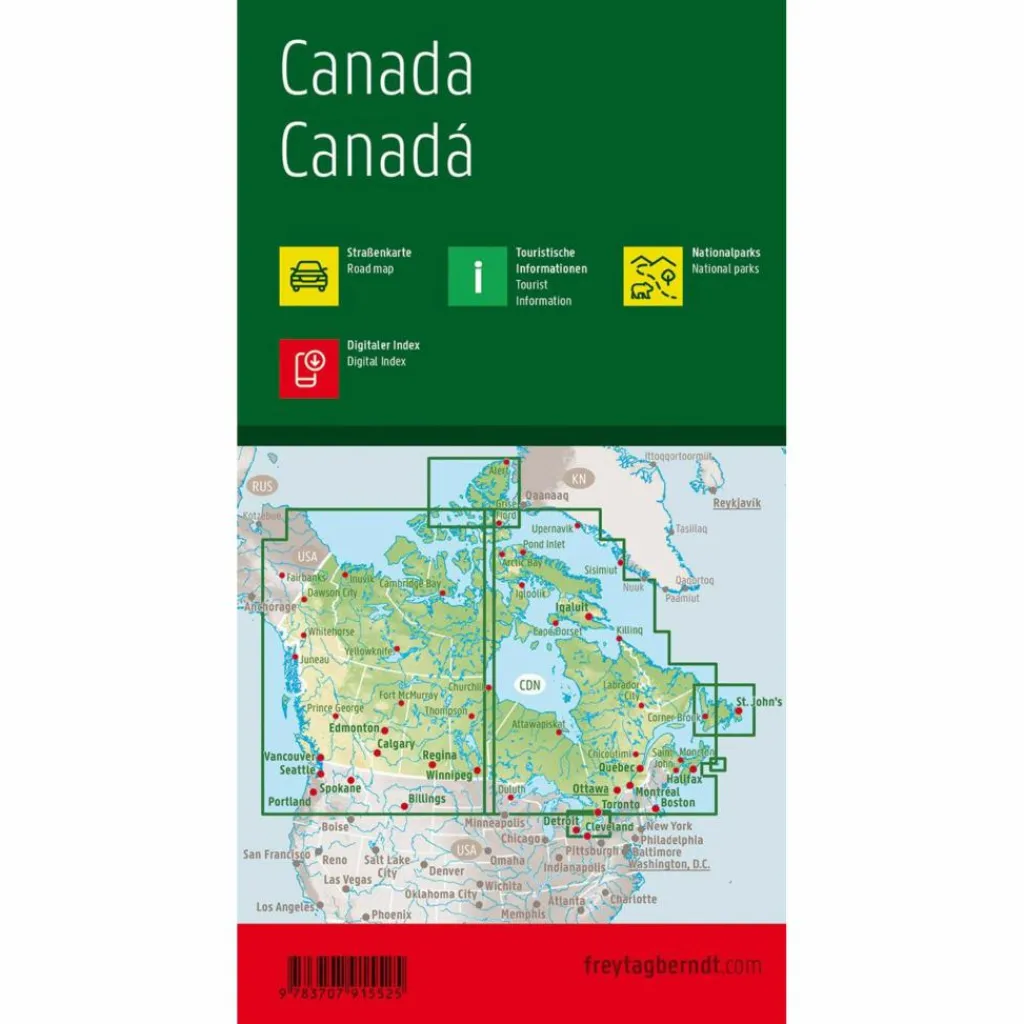 Neben der übersichtlichen Gestaltung verfügt die Straßenkarte „Kanada 1:3.000.000“ über zahlreiche Zusatzinformationen wie z.B. Straßenbeschaffenheit, Sehenswürdigkeiten, Campingplätze und diverse Innenstadtpläne. Mit dem umfangreichen Ortsregister gelingt zudem eine rasche Orientierung. Citypläne von Calgary, Montreal, Ottawa, Toronto, Vancouver; Touristische Informationen, Nationalparks, Ortsregister, doppelseitig; freytag & berndt Autokarten sind für viele Länder und Regionen weltweit erhältlich.