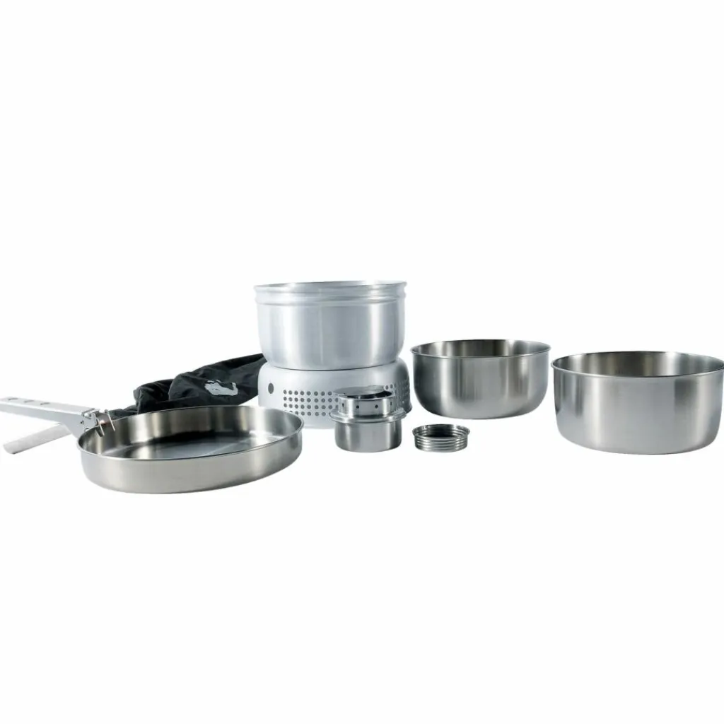 Sturmkocher-Set mit Spiritusbrenner. Töpfe und Pfanne bestehen aus lebensmittelechtem, unbedenklichem 18/8 Edelstahl (rostfrei). Ideal für die Zubereitung aller Arten von Speisen.