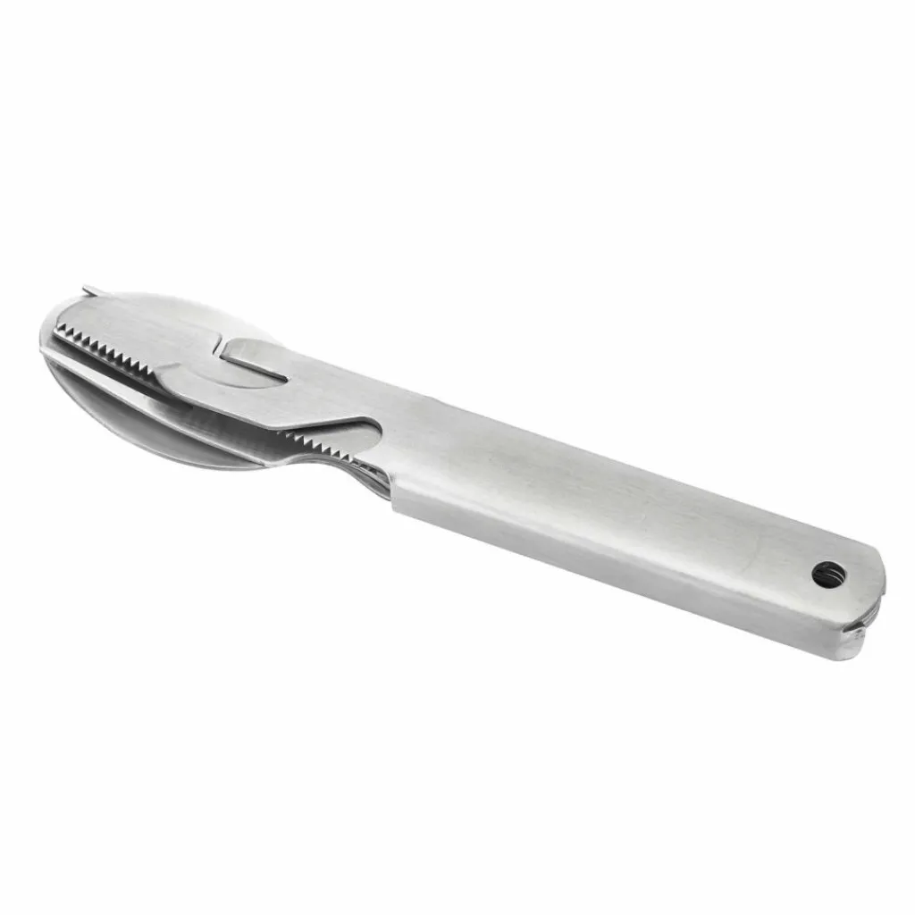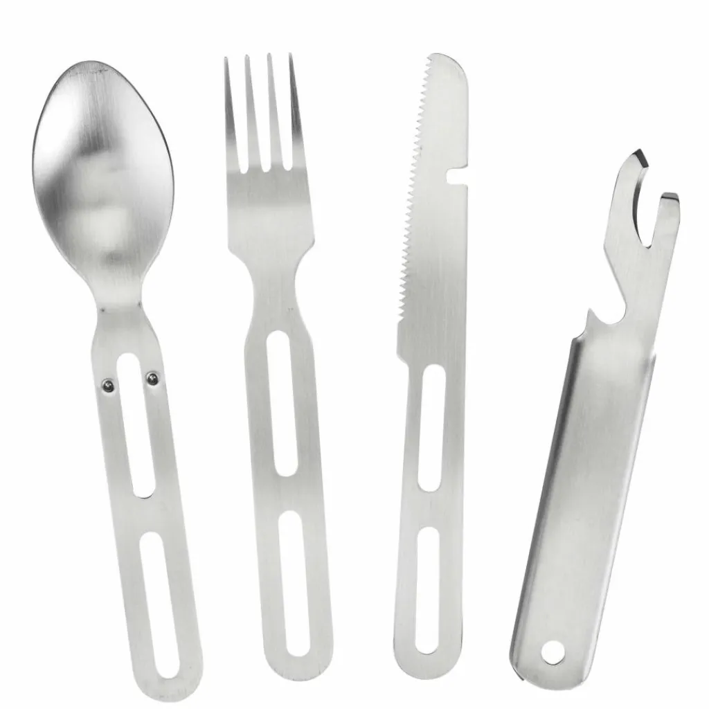 Der Nachbau des bekannten Bundeswehrbestecks mit Messer, Gabel, Löffel und Dosenöffner. Hier jedoch aus rostfreiem und robusten 18/8 Edelstahl. Die Aussparungen an den Griffen reduzieren das Gewicht.