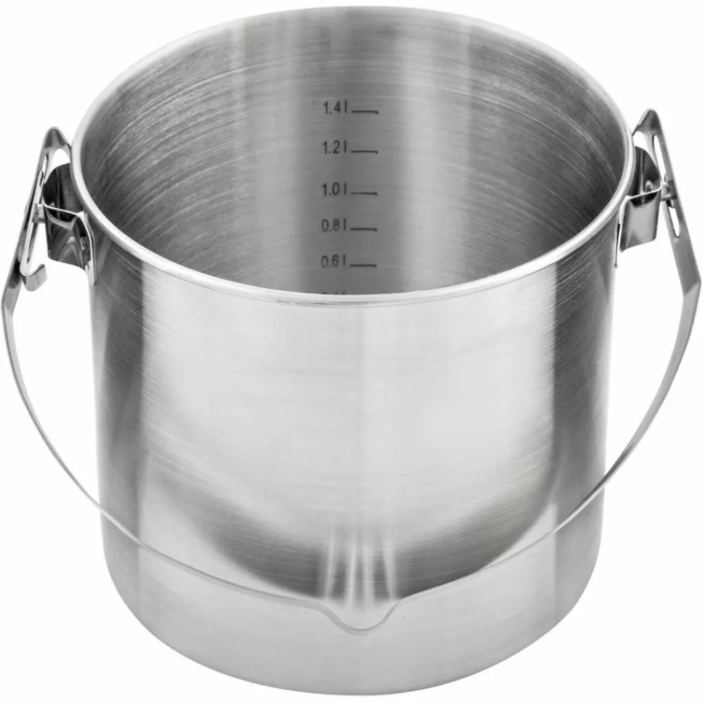 Kleiner Topf aus Edelstahl mit 1400 ml Volumen. Am kräftigen, vorgebogenem Henkel kann der Topf über ein Lagerfeuer gehängt werden und eignet sich damit hervorragend für Bushcrafter und Pfadfinder.