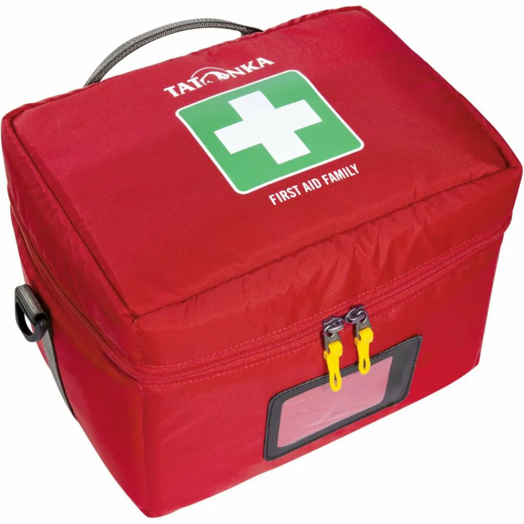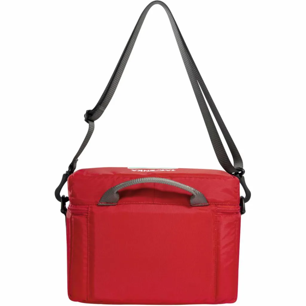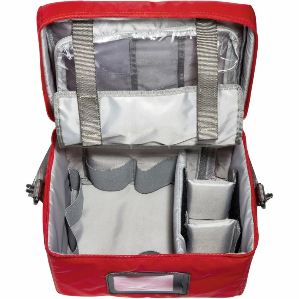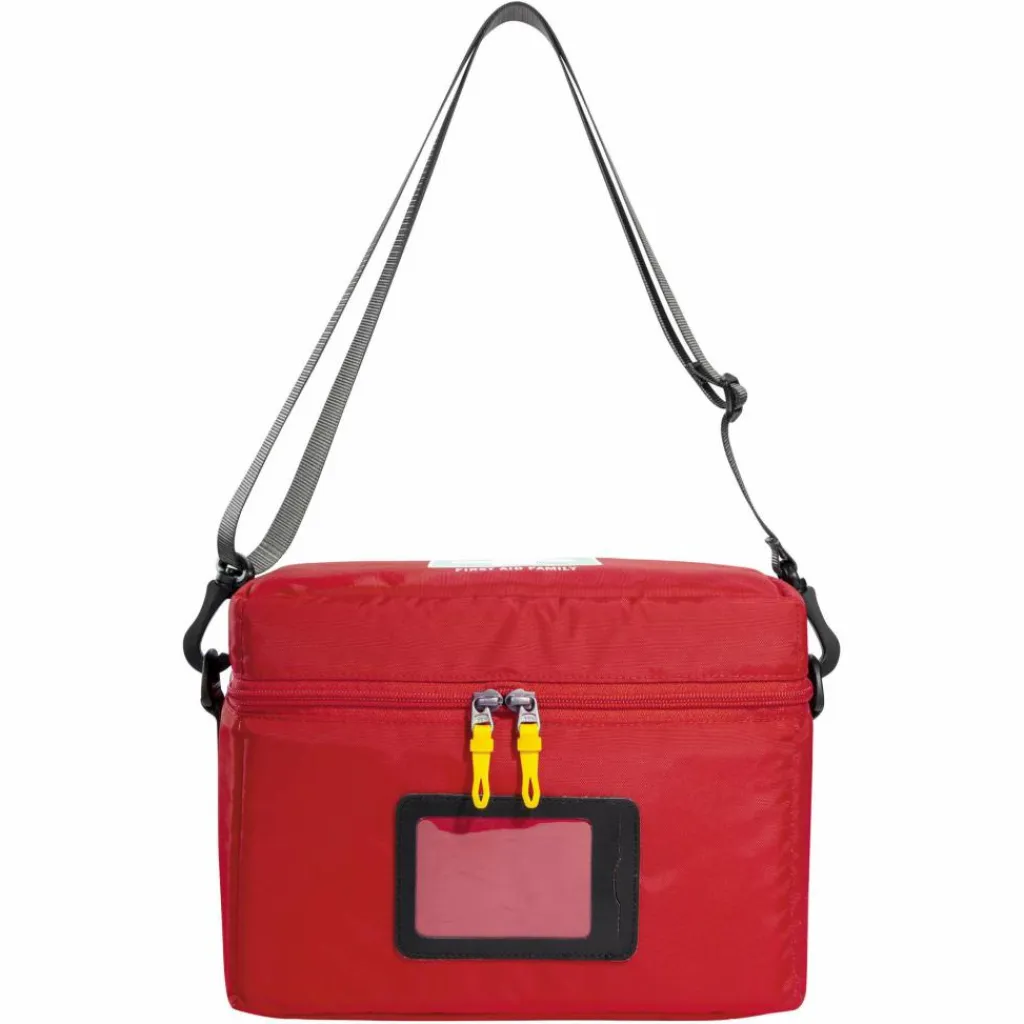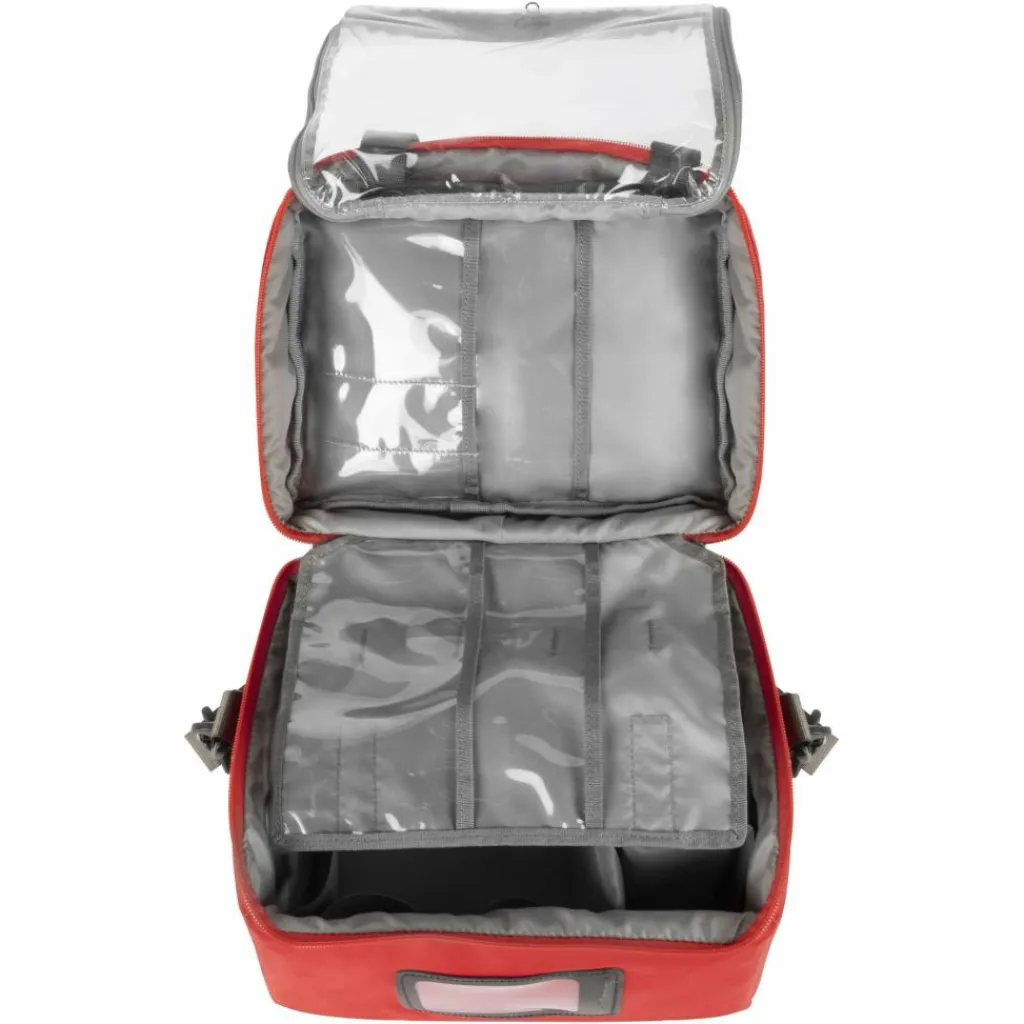 Erste-Hilfe-Box (ohne Inhalt) mit Klappdeckel und gepolsterter, ausklappbarer Unterteilung. Mit Trageriemen, Befestigungsschlaufen und 2-Wege-Reißverschlussfach.