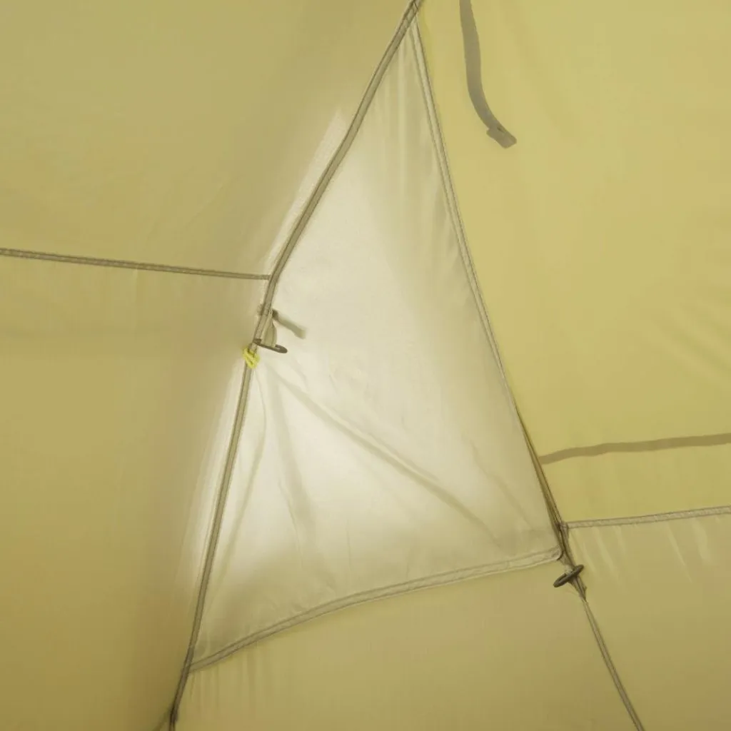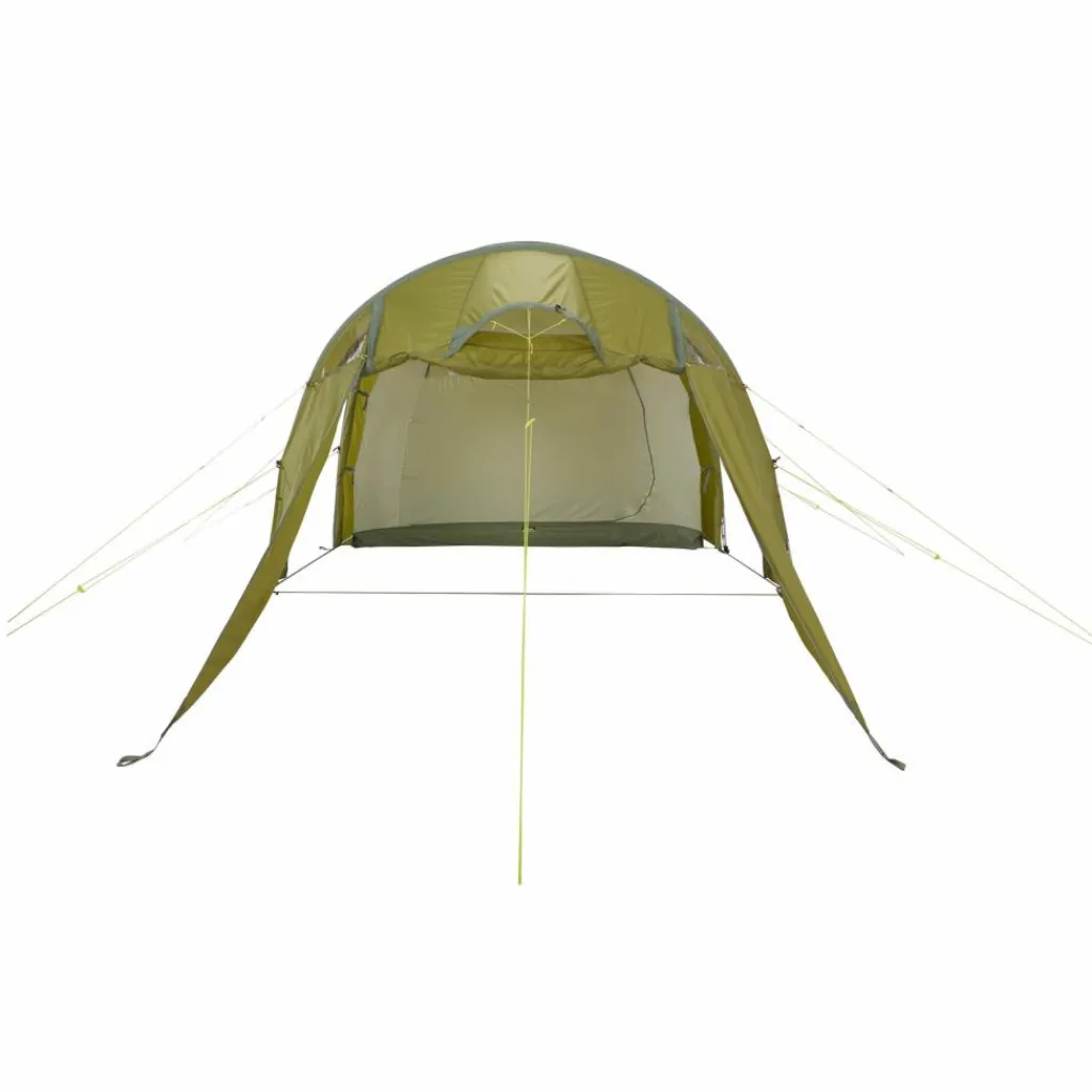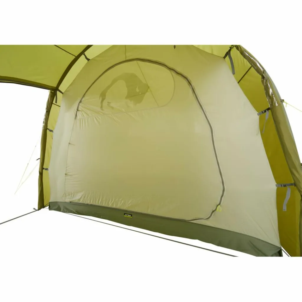 Die großzügig geschnitten Apsis hat viel Platz und vor allem Stehhöhe (205 cm) – dadurch lässt sie sich vielfältig nutzen: Als Abstellmöglichkeit für Gepäck, Tisch und Stühle, bei einem Fahrradurlaub können die Räder mit ins Zelt genommen werden, bei schlechtem Wetter dient sie als Aufenthaltsraum und erweitert so den Bewegungsradius im Zelt. In das Innenzelt gelangst du auf unterschiedlichen Wegen: durch einen der beiden seitlichen Eingänge über die Apsis oder über den rückseitigen Eingang direkt ins Innenzelt. Die Fenster in der Apsis sorgen zudem für Lichteinfall und Ausblick, können bei Bedarf aber auch abgedeckt werden.