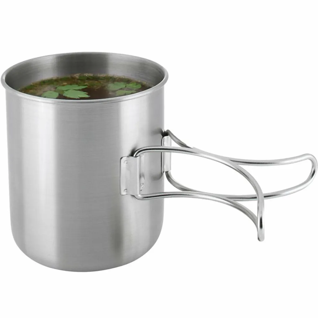 Becher mit 600 ml Volumen, den du dank der robusten Ausführung auch als kleinen Topf verwenden kannst. Die klappbaren Handgriffe reduzieren das Packmaß auf ein Minimum.
