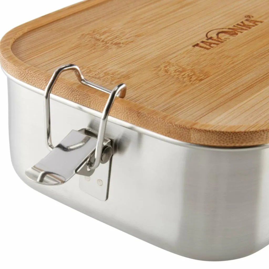 Edelstahldose mit 1000 ml Volumen, Bambusdeckel und Bügelverschluss. Der Deckel kann auch prima als Brettchen dienen, um Käse, Wurst oder Gemüse zu schneiden.
