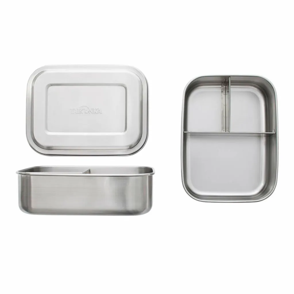 Große Brotdose aus Edelstahl. Die Fächeraufteilung im Innern ist fest verbaut und verschiebt sich daher beim Transport nicht.