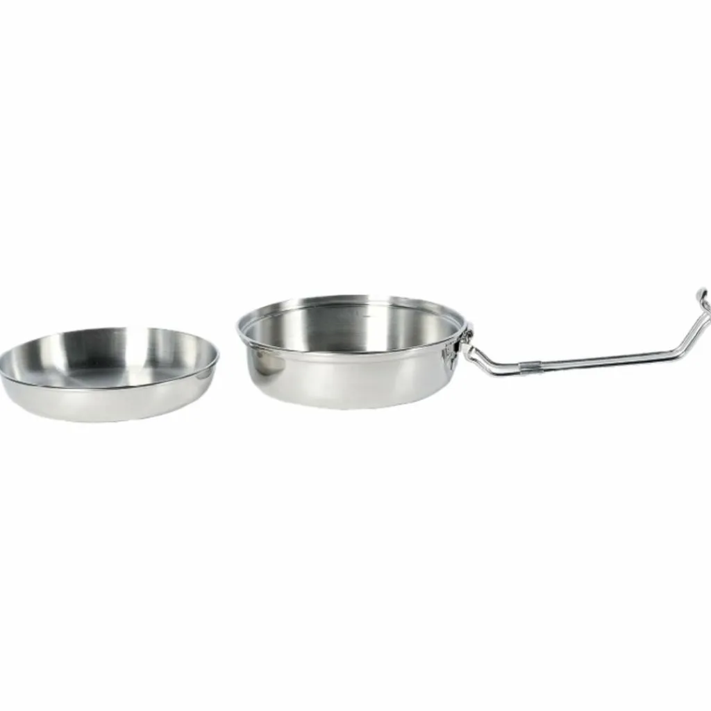 Kochset mit klappbarem Griff und 0,6 Liter Volumen. Für Trekking und Camping. Das kleine und praktische Camping-Kochset aus 18/8 Edelstahl besteht aus einem Topf mit Deckel, die gleichzeitig als Schüssel und Teller verwendet werden. Der Griff für den Topf lässt sich klappen und dient als Bügelverschluss für das Set. Der Topf fasst 0,6 Liter. Das Set ist unzerbrechlich, lebensmittelecht und leicht zu reinigen.