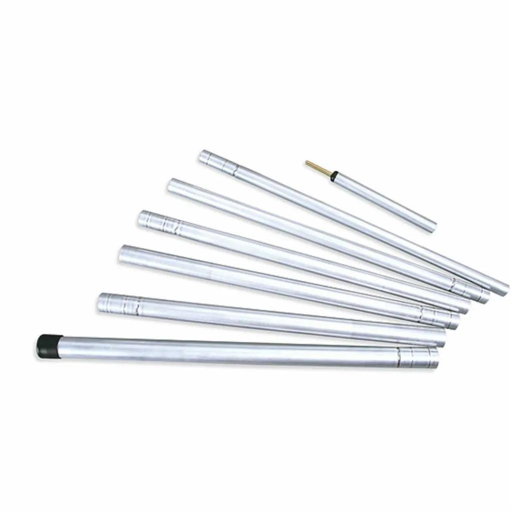 Die Aluminium-Stangen werden aus unterschiedlichen Rohrdurchmessern zusammengesetzt, dadurch lassen sie sich zum Transport exakt ineinanderschieben.