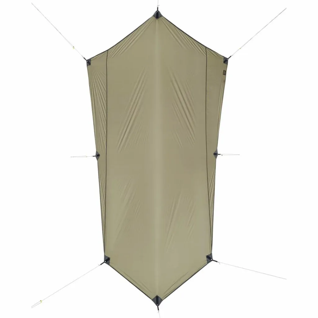 Der Schnitt erlaubt eine Vielzahl an Aufstellvarianten. Tief abgespannt schützt es Schlafsack und Ausrüstung vor Wind und Regen, hoch abgespannt bietet es eine geschützte Fläche zum Kochen oder gemütlichen Beisammensitzen.